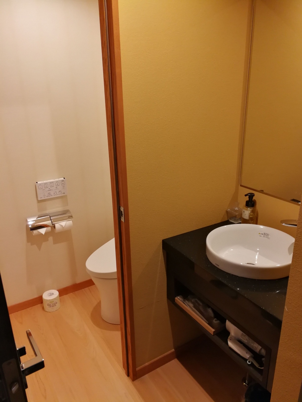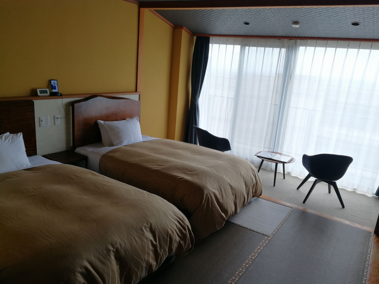 客室は本館ツイン。畳敷きの部屋にベッドが二台。広縁に椅子二脚とティーテーブル一脚。使い易い部屋だと思う。洗面所と手洗いは設備が新しい上に大変美しく維持されており、清潔感に満ちたものだった。