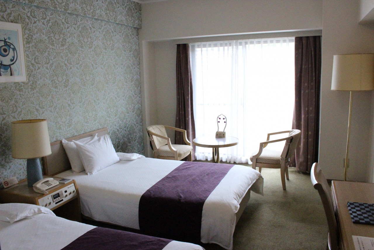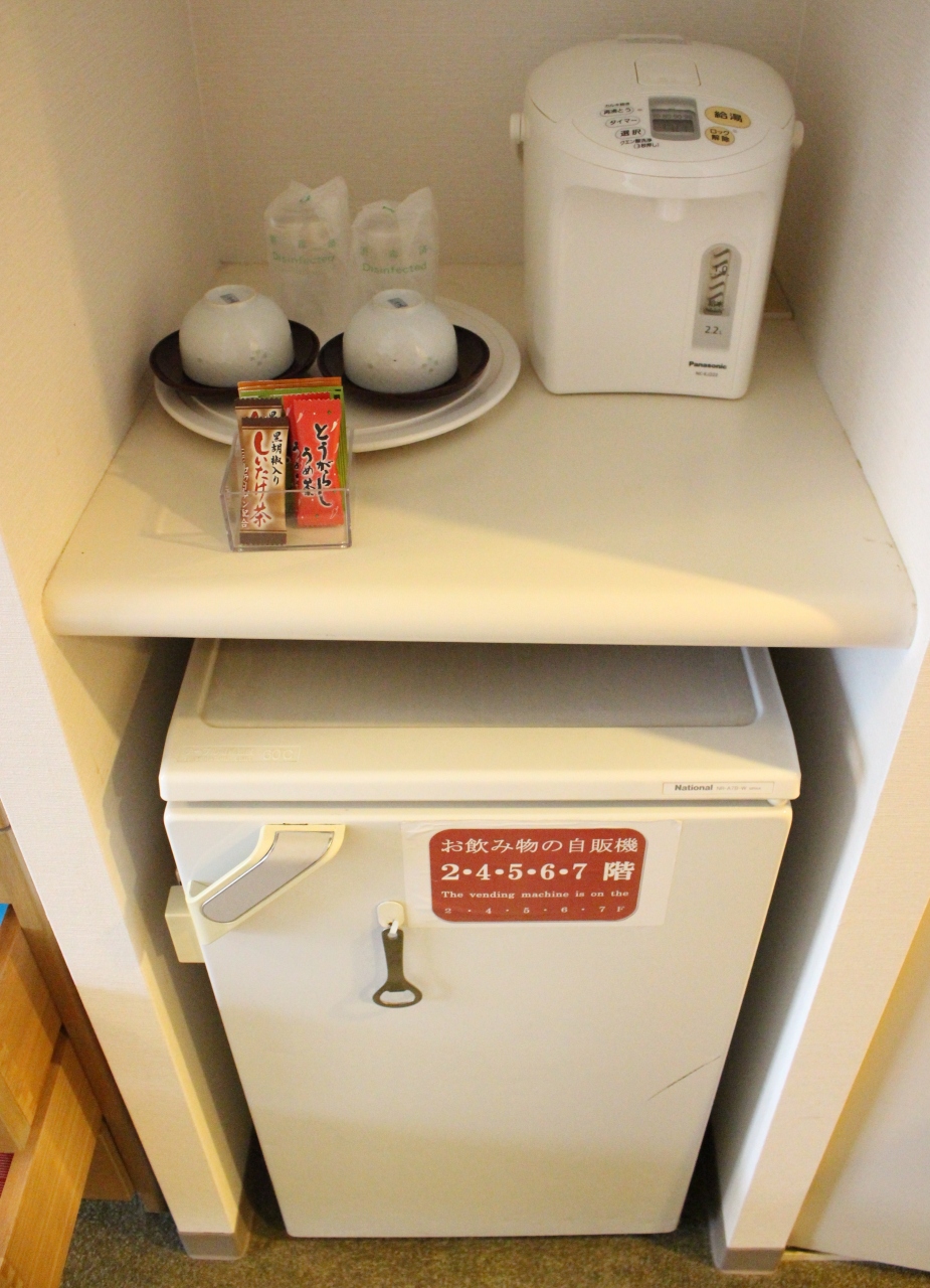 外観はまさにマンション。フロントの横には小さいながらもお土産のコーナーもあり、図書スペースにコーヒーなど自由に飲めるようになっていました。部屋の広さは十分で、ベッドの高さがソファの椅子の高さと同じくらい低めに作られていました。お茶の種類も4種類あり、大浴場前には冷たいお茶とお水、氷も置いてありました。お風呂上りにそこで氷を部屋に持ち帰りました。