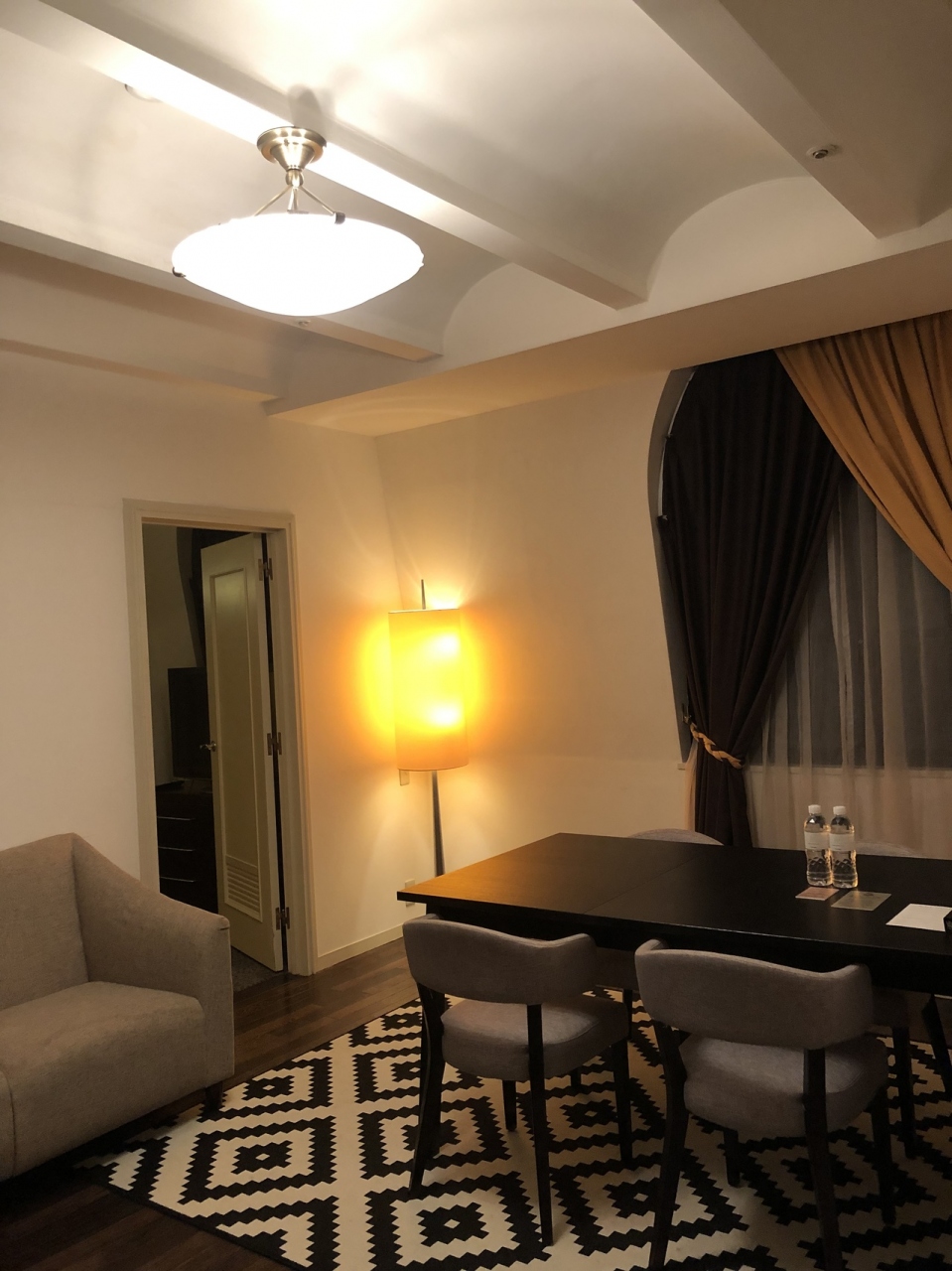 夜のチェックインでもったいなかったですが、部屋に空きがあったのか追加料金でアップグレードできますと、言われたので、スイートルームという言葉につられて、お願いしてしました。予約した部屋が、セミダブルの2名利用だったのですが、スイートルームは、ベッド幅220センチの横にも縦にも寝れそうなくらい広いベッドでした。リビングルームも、バスルームも広くて、シャワーブースもあり。冷蔵庫はドリンクフリー。