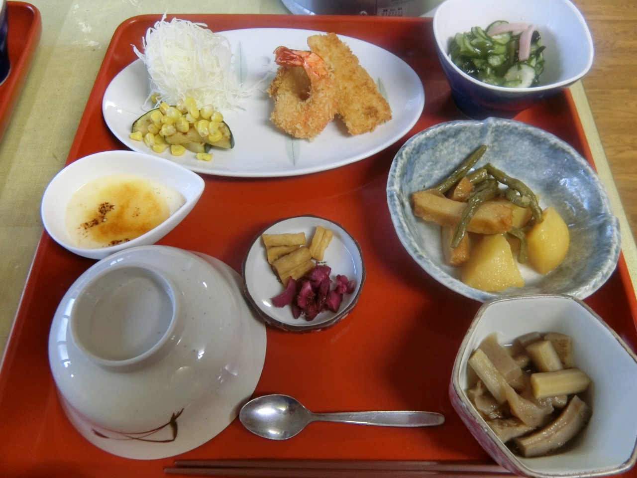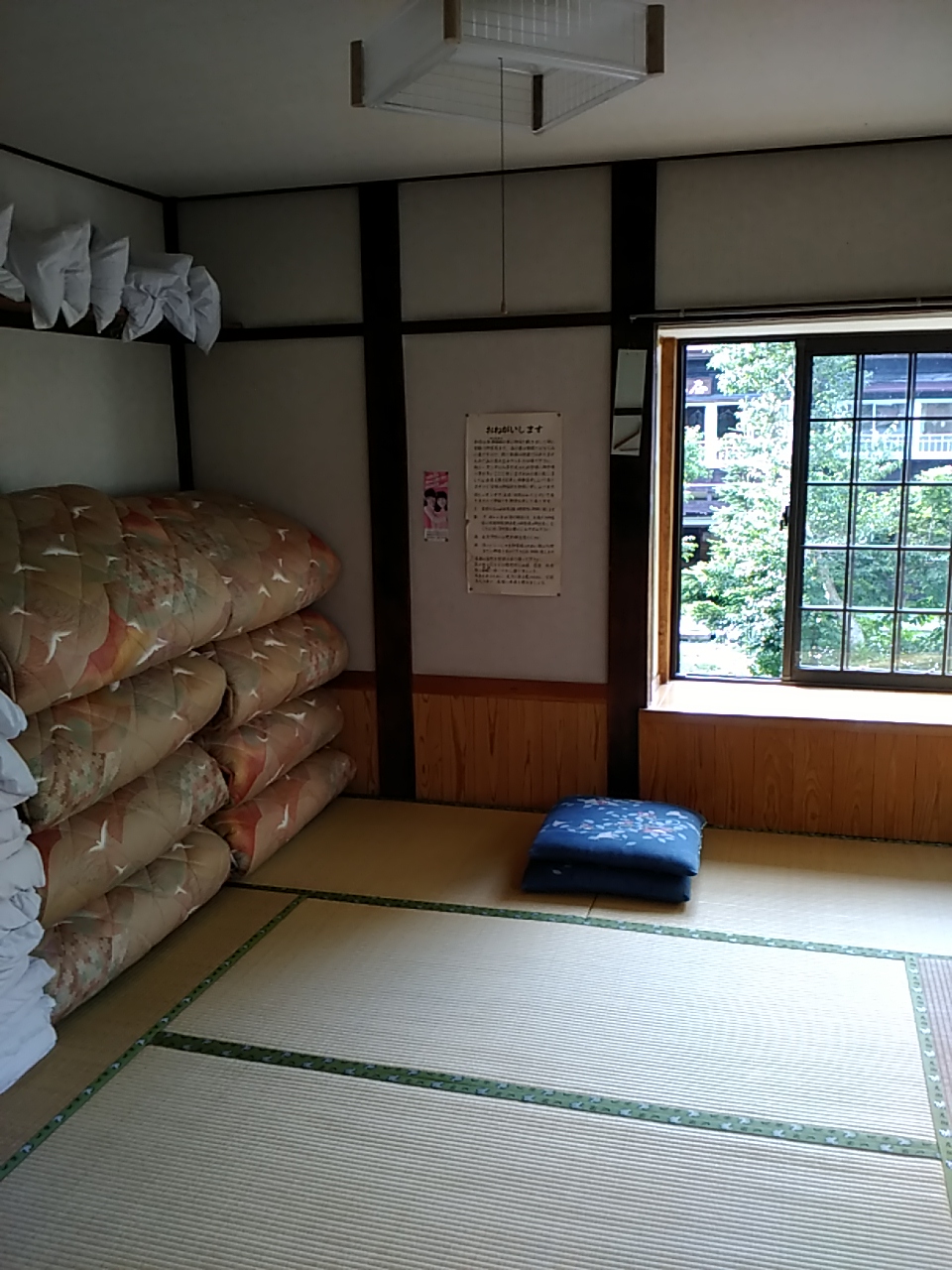 フワフワの布団、パリッとしたシーツ、お風呂(石鹸は使えない)、ウォシュレット付き水洗トイレ(全く臭わない)、おかずたくさんの夕食。お弁当にしてもらった朝食は大きなおにぎり2つに味付け卵、炒めたソーセージ、塩昆布で和えたキュウリ、かまぼこ、味噌のシソ巻き、フルーツ缶詰。