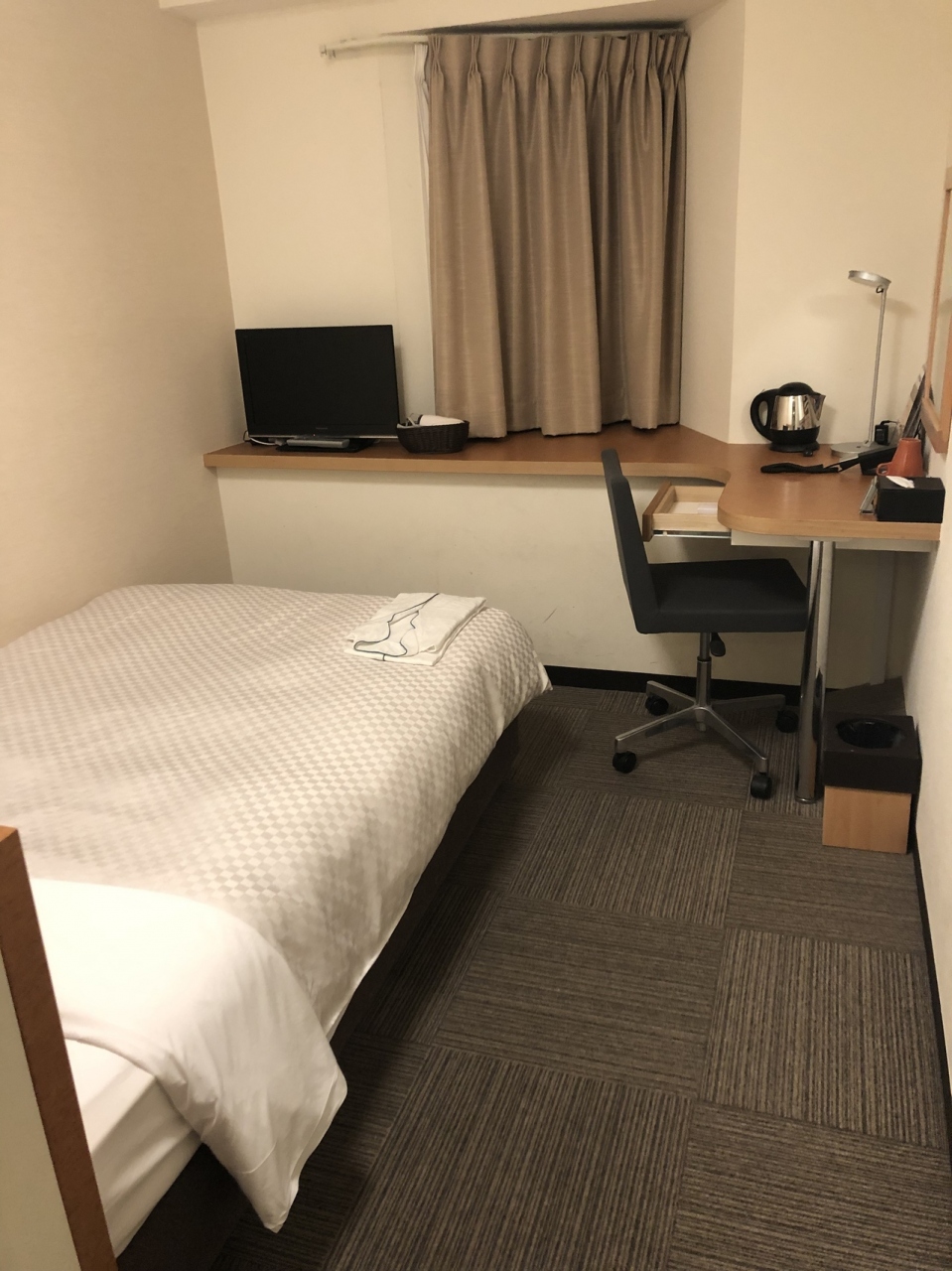 立地がとても良い。博多駅の筑紫口出て2、3分歩いたヨドバシカメラのすぐ横。場所が良いのに宿泊料金が比較的安い。部屋は狭いがふつうのビジネスホテル並で全く問題なし。アメニティも普通で出張利用なら特にお勧めできます。価格を考えると博多駅周辺ではここ以外に泊まれません。