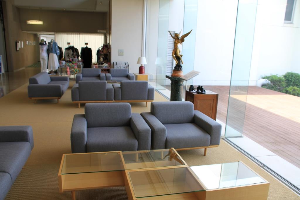 こじんまりとしたロビーの窓ガラスは、東京湾に面しており、ここに大型客船の通過時刻が掲示されて、沖を行く船を見るために双眼鏡が置いてあるのが、なかなか嬉しい演出です。