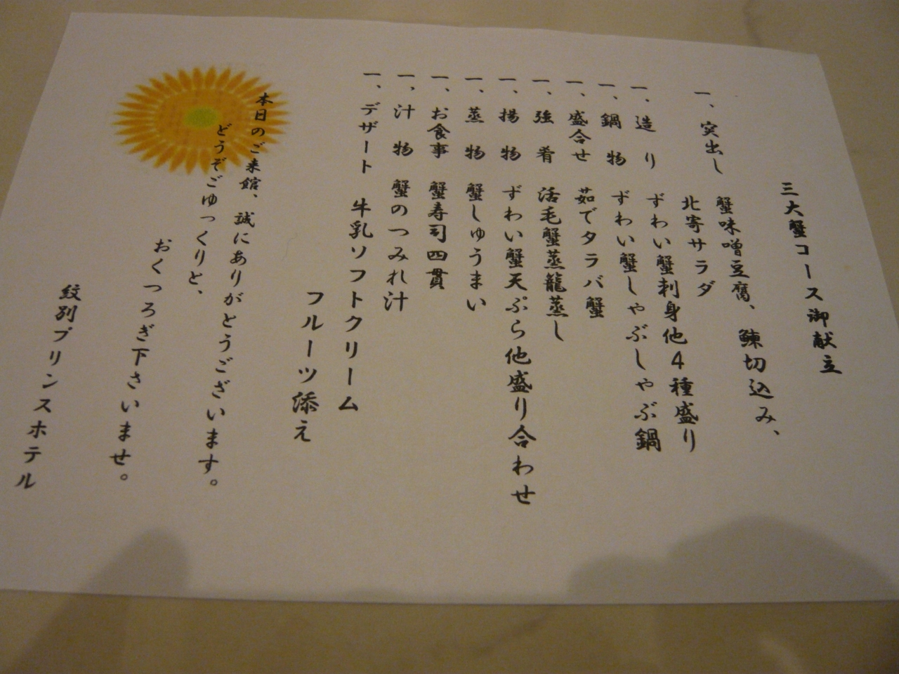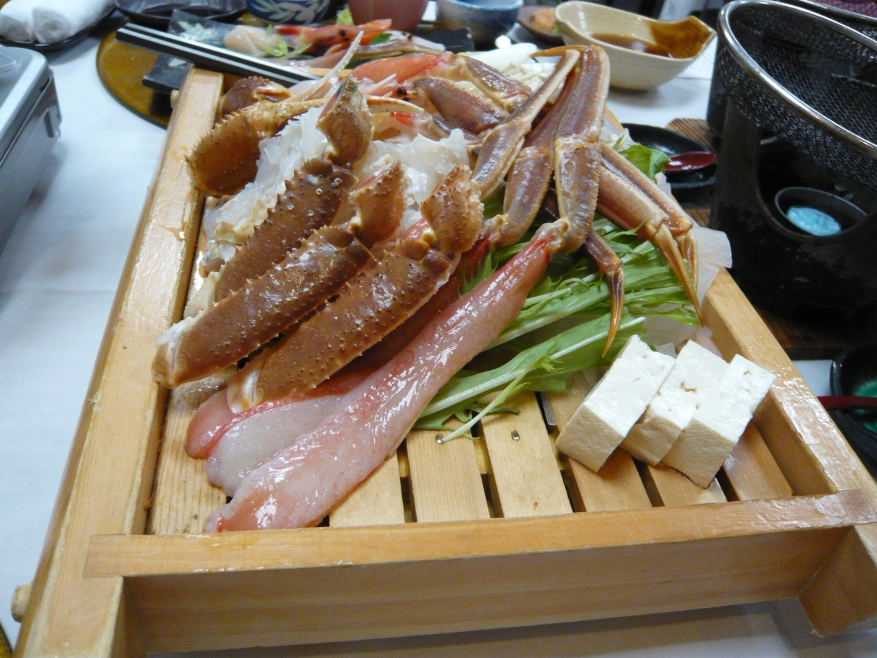 2食付プランで夕食は『三大蟹コース』にしましたが、食べきれないほどの蟹料理でおいしくいただきました。朝食もお刺身やカニ汁などがあり、豪華なものでした。