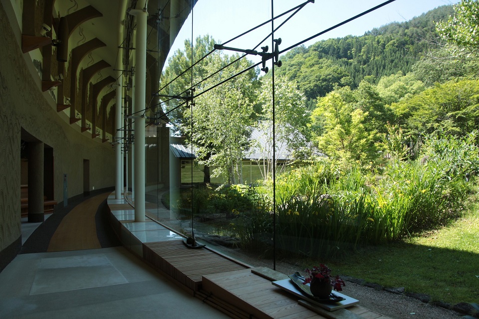 ブログなどで情報収集すると、雪景色や紅葉も素敵そうでしたが、私が一番惹かれたのは新緑。カーブした全面ガラス張りの廊下の向こうに瑞々しい緑のお庭が広がる景色が見たくて、初夏に訪れました。