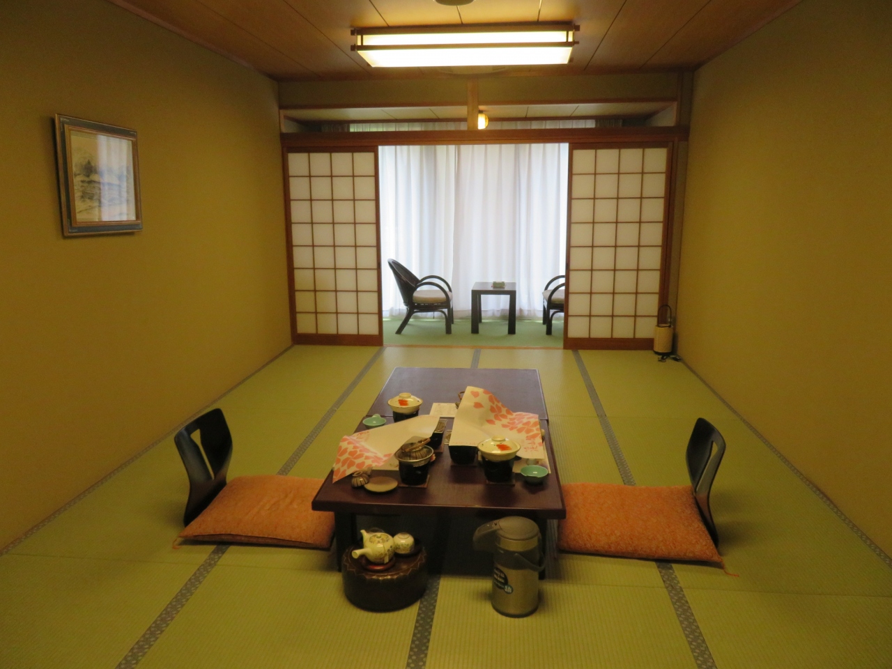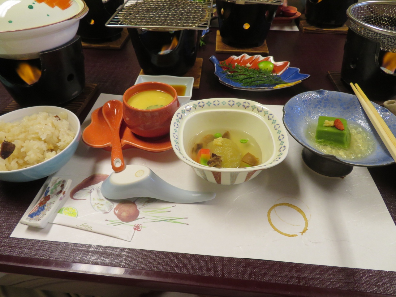 実際には宿泊はしていないが2時間半滞在して、温泉に1時間ぐらいゆっくりと入浴し、食事もマッタケ尽くしの料理を部屋食で、ビールは中瓶で少し高いけれどまあこんなもんか、1時間ぐらい3度ほど料理を都度は混んできた。