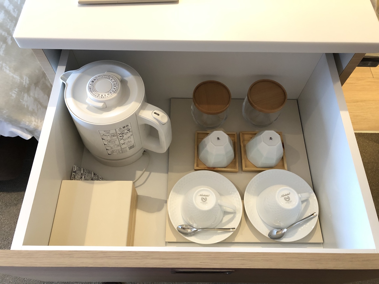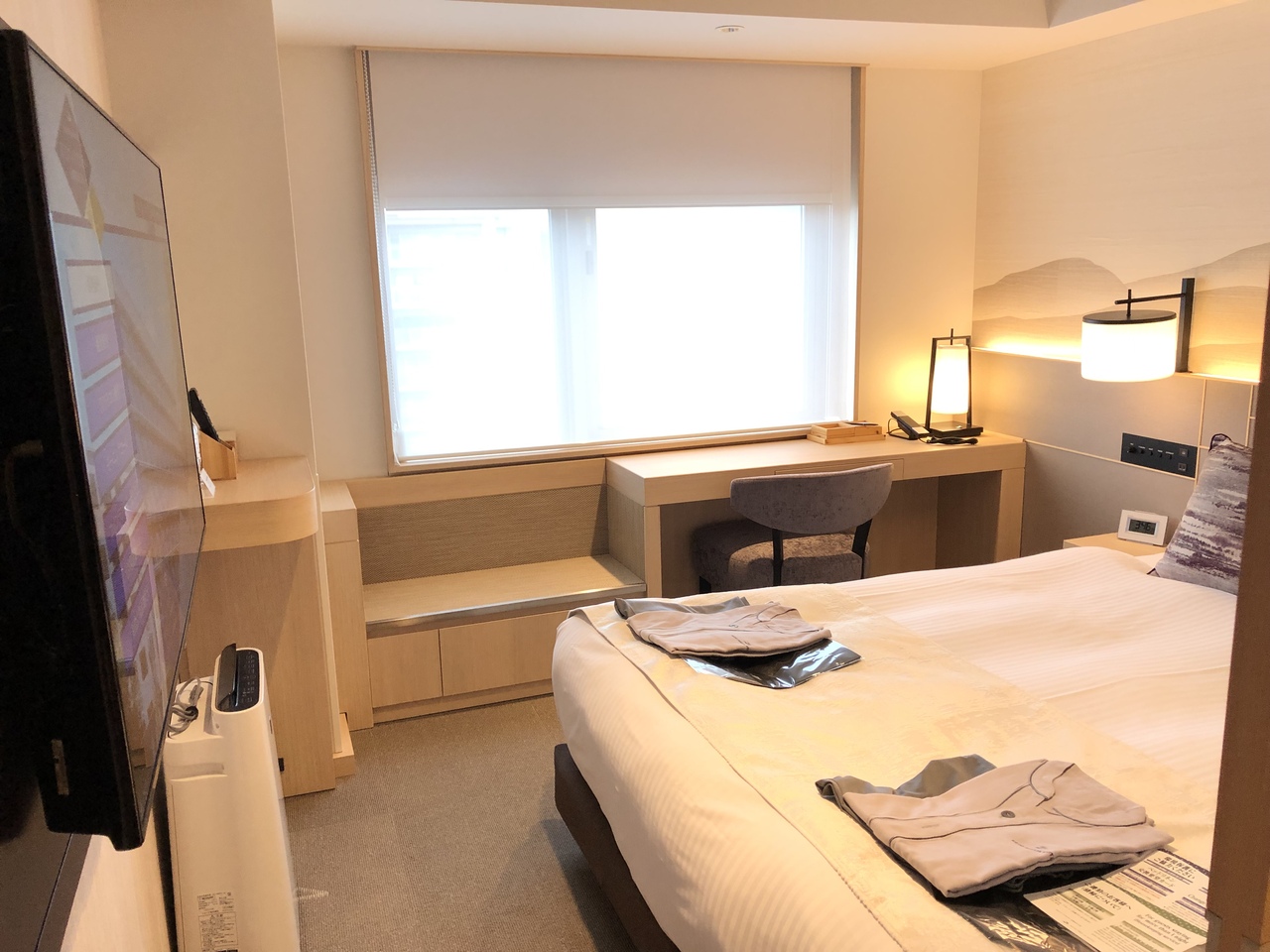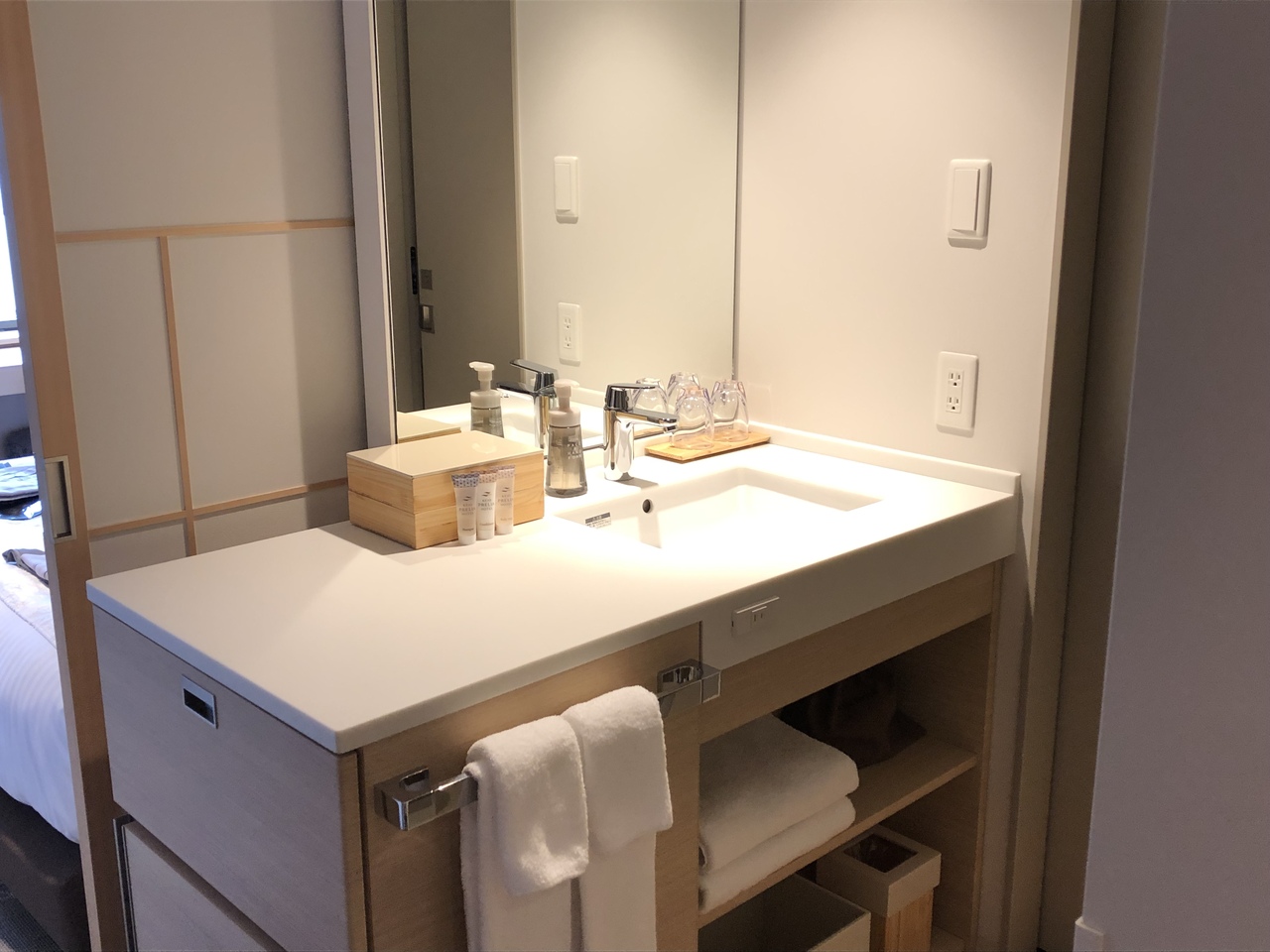 部屋は綺麗で、小物トレイが置いてあったり、グラスが充実していたりして、部屋にいる時間が非常に快適。マットレスもかなり良い。