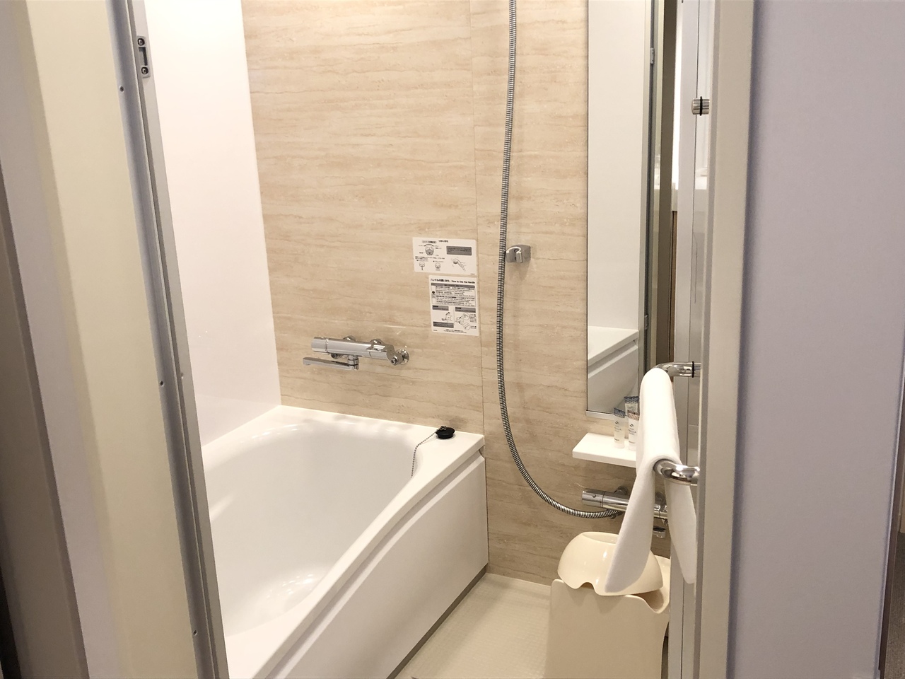 お風呂も一般住宅の新築のバスルームといった感じで、とても綺麗。足も伸ばせます。