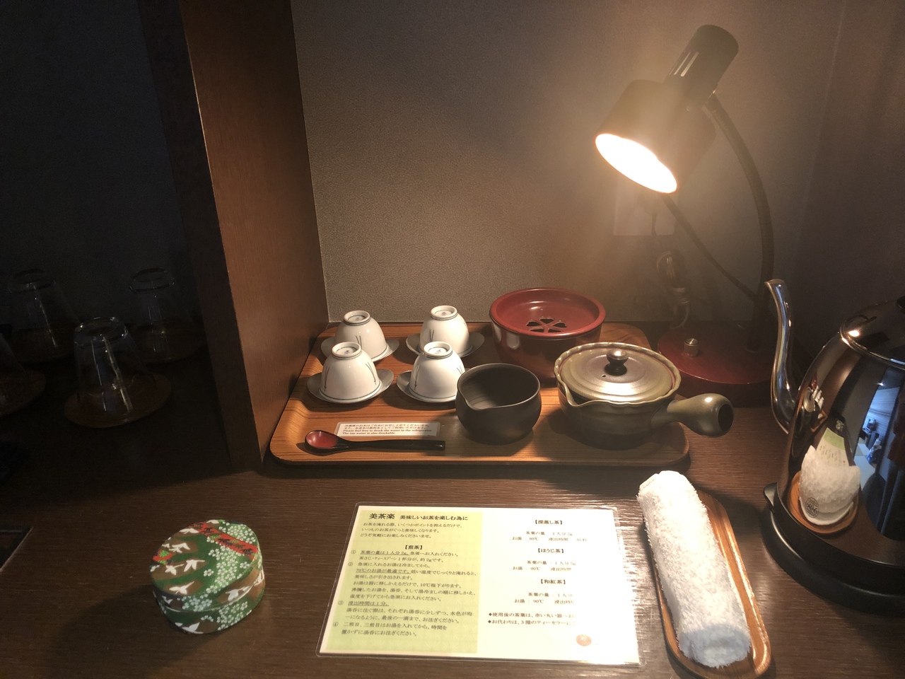 客室にはお茶っぱと茶器セットが用意されていて、お茶っ葉は十二種類が用意されていました。