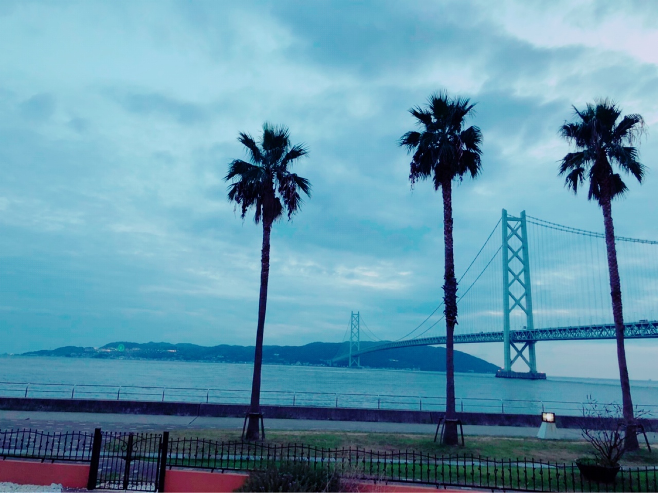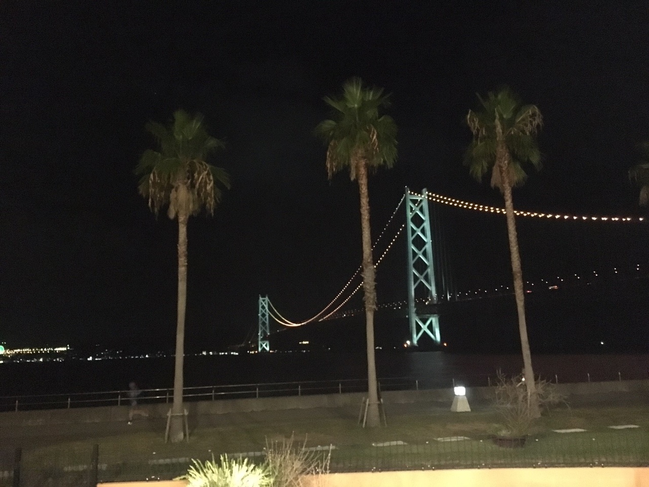 駐車場は、ディナー利用者は無料です。ホテルエントランスからとてもいい雰囲気で、全面ガラス張りが綺麗でした。バーベキュー会場はホテルの屋外のお庭でした。見渡す限りの広々とした海、そして明石海峡大橋。最高のパノラマビューです。夕暮れの空も素敵でしたが、夜の夜景も明石海峡大橋がきらめいて綺麗でした。