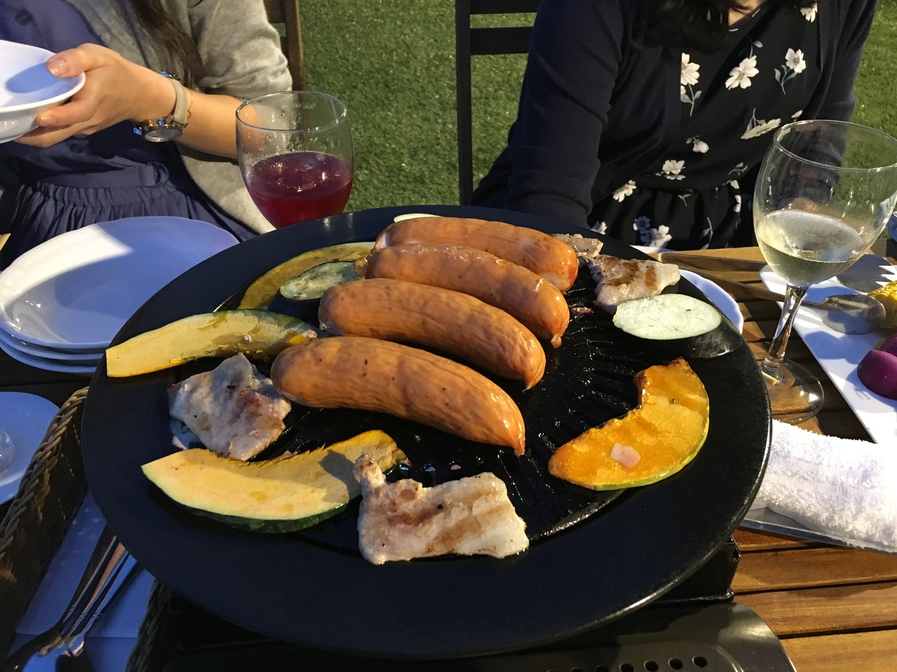お料理は、前菜が複数の選択肢から2種選べます。鯛のカルパッチョと生ハムにしました。ドリンクは飲み放題で、アルコールはサングリアなど女性に喜ばれそうなカクテル類が豊富に揃っていたように思います。ソフトドリンクは、瓶コーラと瓶ジンジャーエール、アップルジュースとオレンジジュースでした。メインのお肉は、ボリュームたっぷりで、身も柔らかく美味しかったです。一番印象的だったのは、BIGウィンナーでした。熱々焼きたてをかぶりつきました。