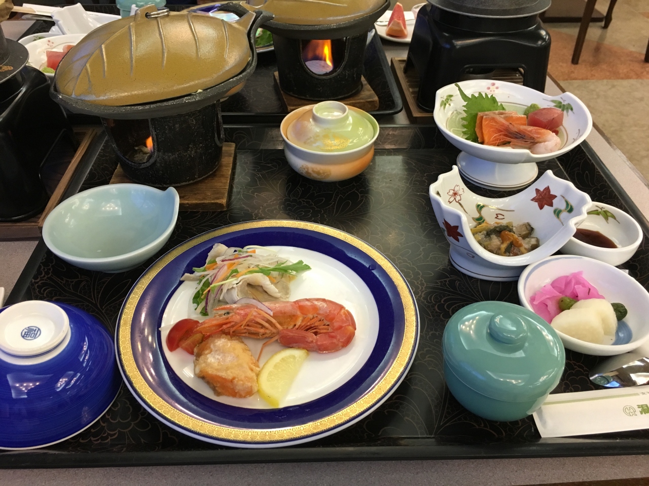 食事は安いプランなので、レストラン会場での定食メニュー。私達にはちょうど良かったですが、若い方には物足りないかも。バイキングの料理も一部並んでいて、そちらも自由にどうぞ、とのことでした。デザートのスイカだけいただきました。