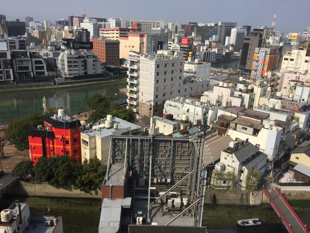 部屋の窓から中州のお風呂屋さん(大人向けの)なんかが見えて、社会勉強になります。