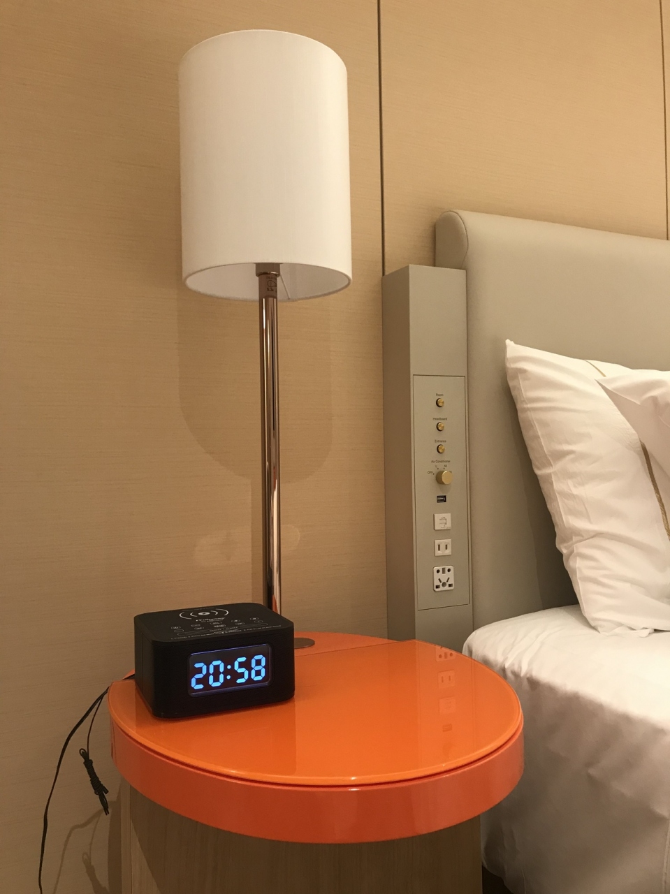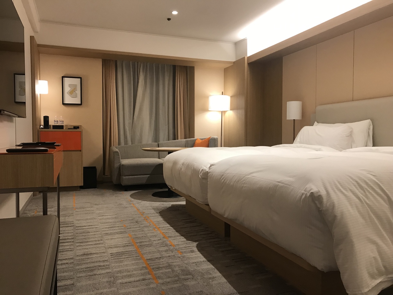 水回り含めて改装済の部屋で、他のフロアに比べて気持ち良く宿泊出来ました(単に設備も含めて新しいという意味で)。オレンジ色をアクセントに使用しています。ツインの部屋にはBluetoothで使用できるスピーカー(というか時計)が置かれており、スマホと接続して楽しむことができました。またコーヒーマシンがネスプレッソだったのでこちらも美味しくいただきました。プレミアムフロアのシングルの部屋に泊まったときはBluetooth用のスピーカーはなく、コーヒーマシンはイリーでした。他の部屋はUCCのポッド式マシン。好みかと思いますが、ネスプレッソが一番香りと濃厚さもあって好みです。ベッドサイドに電源とUSBソケットがあるのも、有難い設備です。