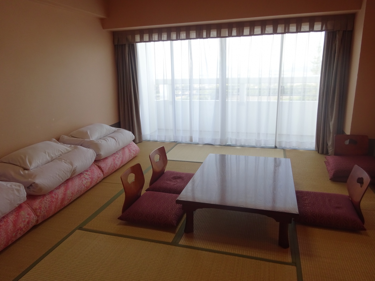 一番お安いと思われる、スタンダードな和室に泊まりました。お安い宿にありがちな、最初からお布団が敷いてあるタイプではなく、中途半端にたたんであって、自分でシーツを敷いてお布団を敷くタイプでした。部屋からは遊園地と讃岐富士が見えました。
