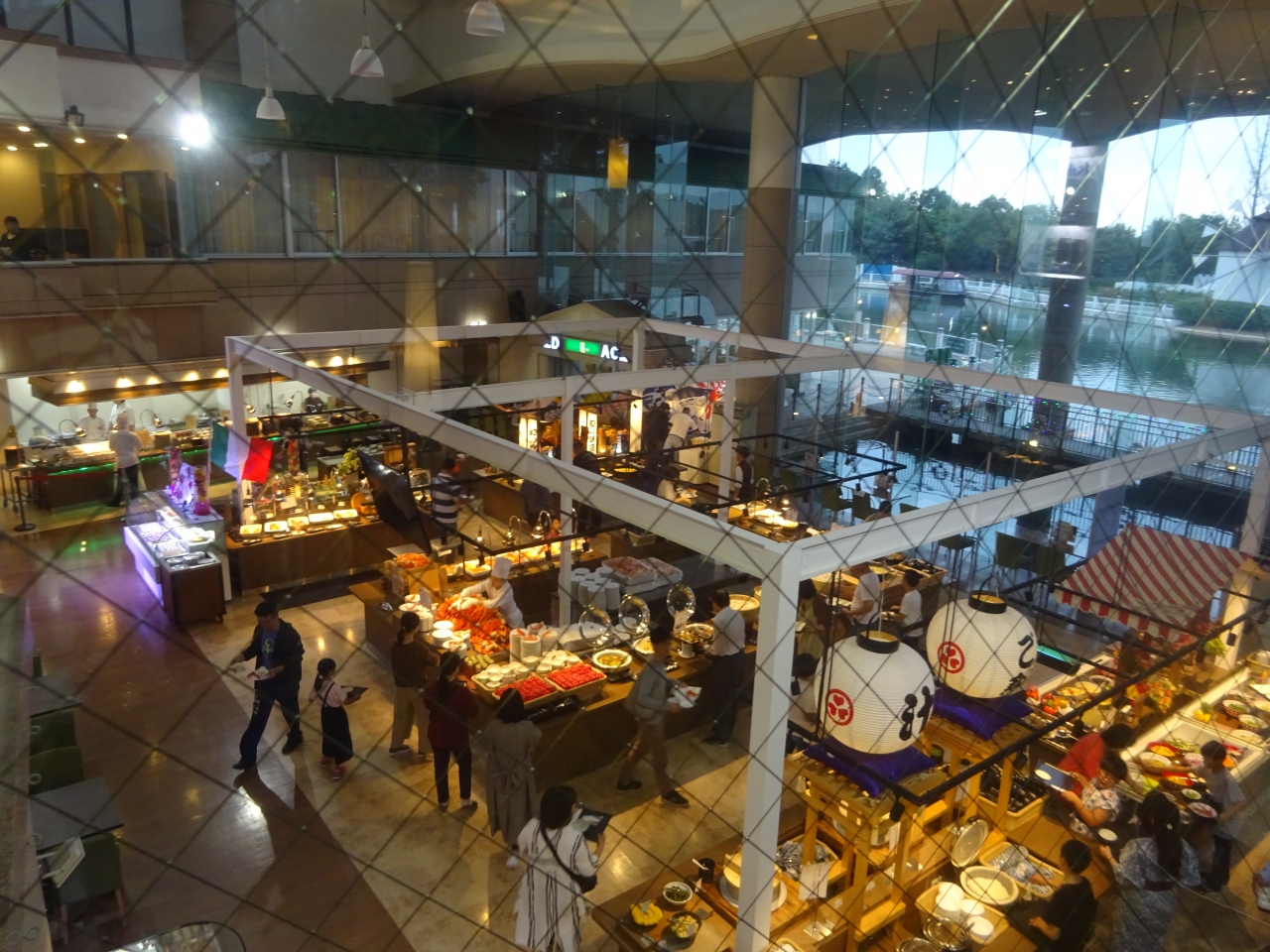 食事はバイキングです。「秋の大収穫祭 蟹食べ放題と旬の味覚満載のグルメバイキング」というのが開催されていましたが、蟹には期待しない方がいいです。というか全然ダメだけど、お値段のことを考えたら仕方がないかなと思います。お料理の種類は多かったですが、レイアウトがちょっと悪いところがあり、無駄に行列ができたりしてました。ツアーなので席は確保されていましたが、入口のオペレーションが要領悪くて個人のお客さんは大行列、ドリンクの清算チェックも手間取っていて、もうちょっとスムーズな方がいいかなと思いました。