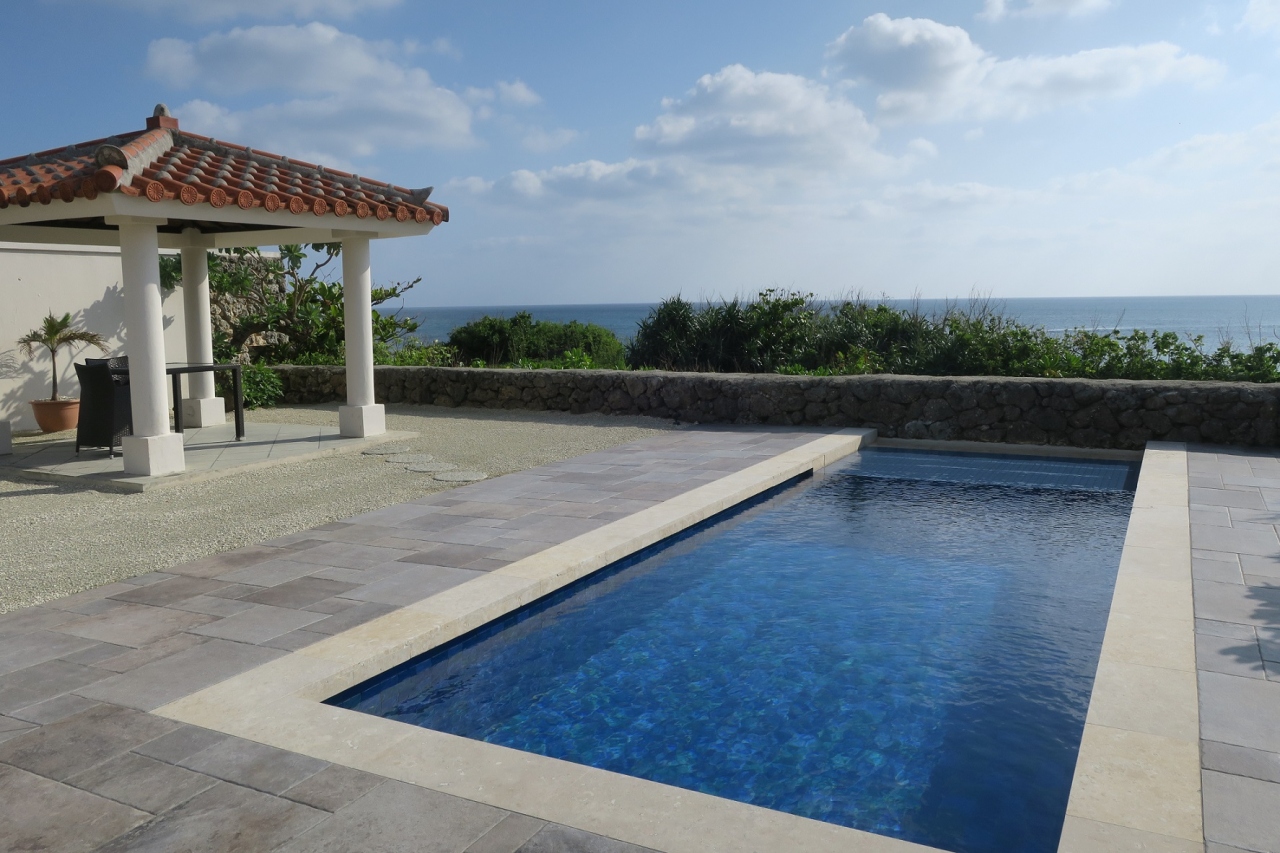 テラスは海に向かって開けており、開放感があります。コンクリート敷きなのが残念。芝生なら足触りも眺めもいいのに。プールは実際に入ってみると、とても小さいです。長さは5.5mくらいとのこと。