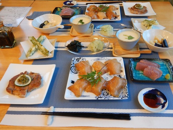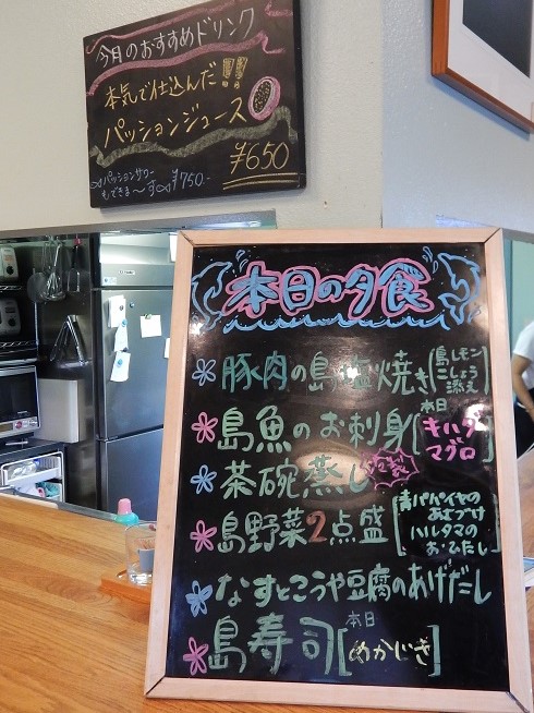 食堂のある建屋と食堂から中庭通路を挟んで宿泊する建屋に通じる。4人部屋の造りは一階に2ベッド、テレビなどとバス、トイレがあり、ロフトに2ベッドがある。食事は島の食材をつかって美味しい。毎日メニューは変わるが、とりわけ島寿司が出された時は父島を実感した。