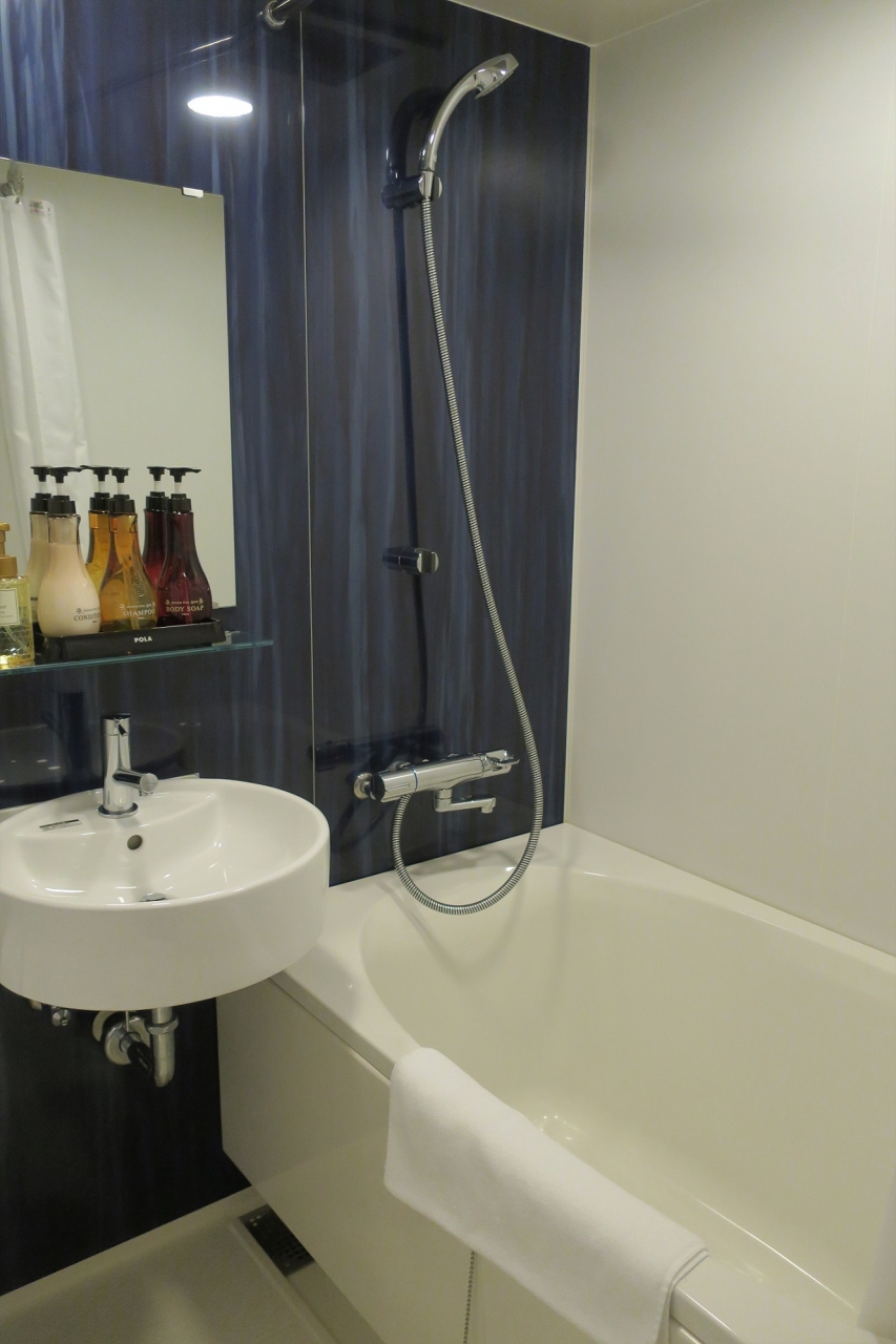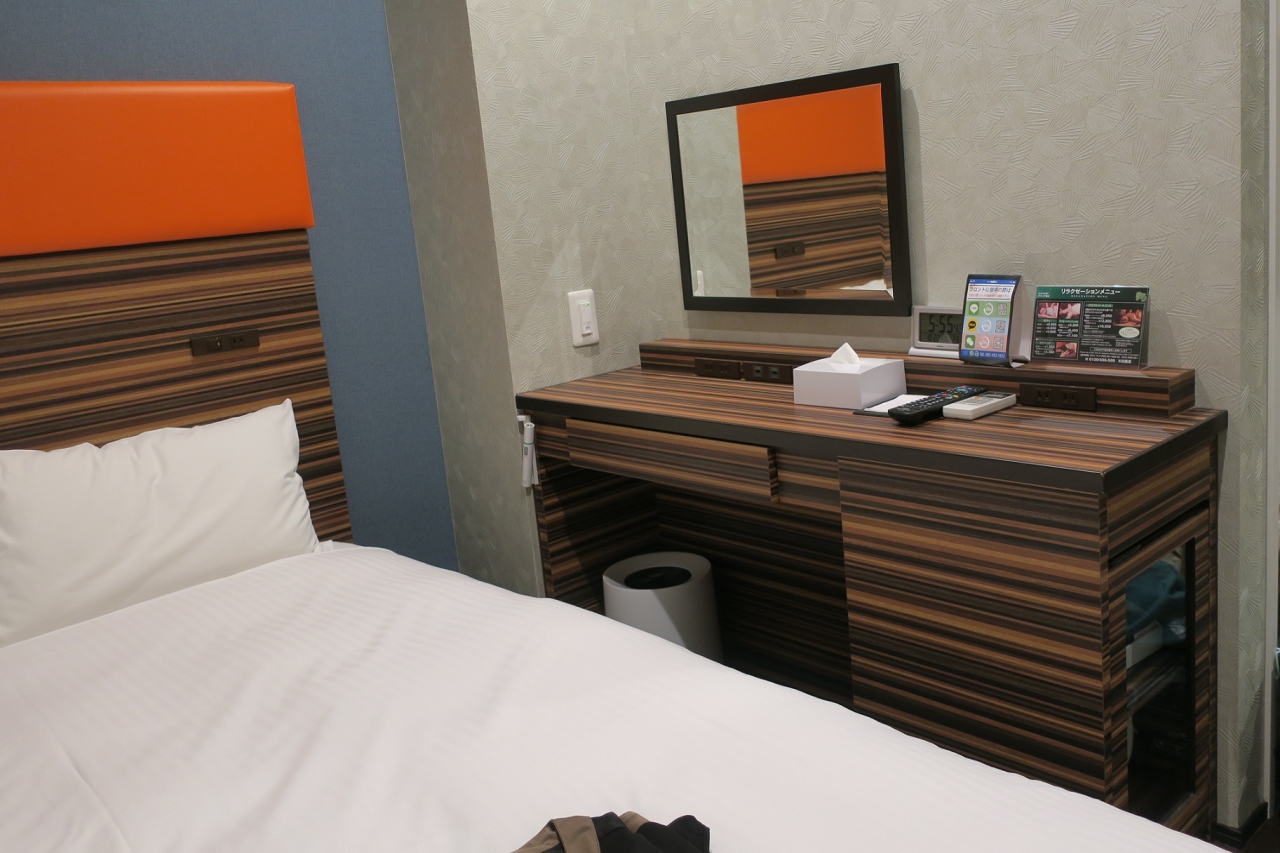 スタンダードダブルベッドの部屋に泊まりました。狭いです。一般的なビジネスホテル同様、鏡や物置台を兼ねて書斎机があるのですが、椅子を置くスペースは無く、ベッドの端に腰掛け、机を使いました。部屋の狭さの割に立派なバスタブがあるのは変な感じ。大浴場があるのに(笑)