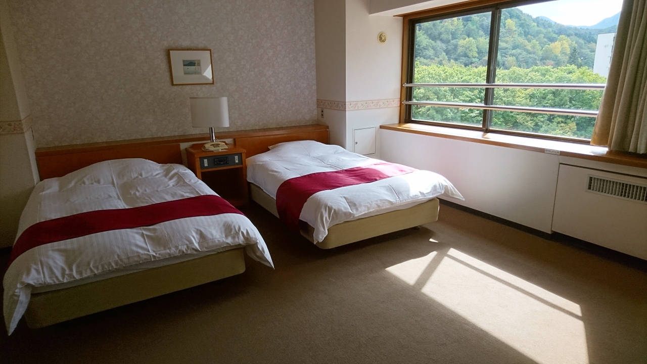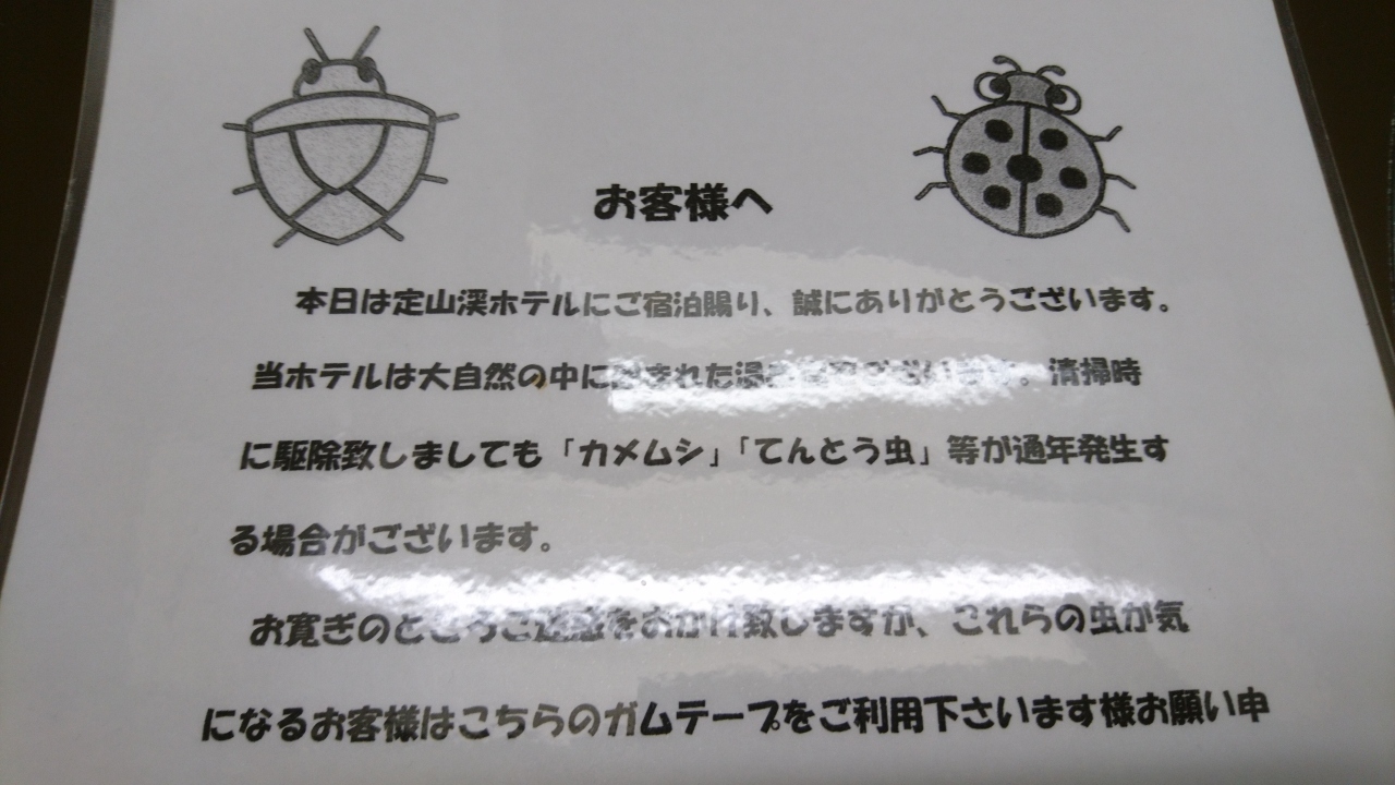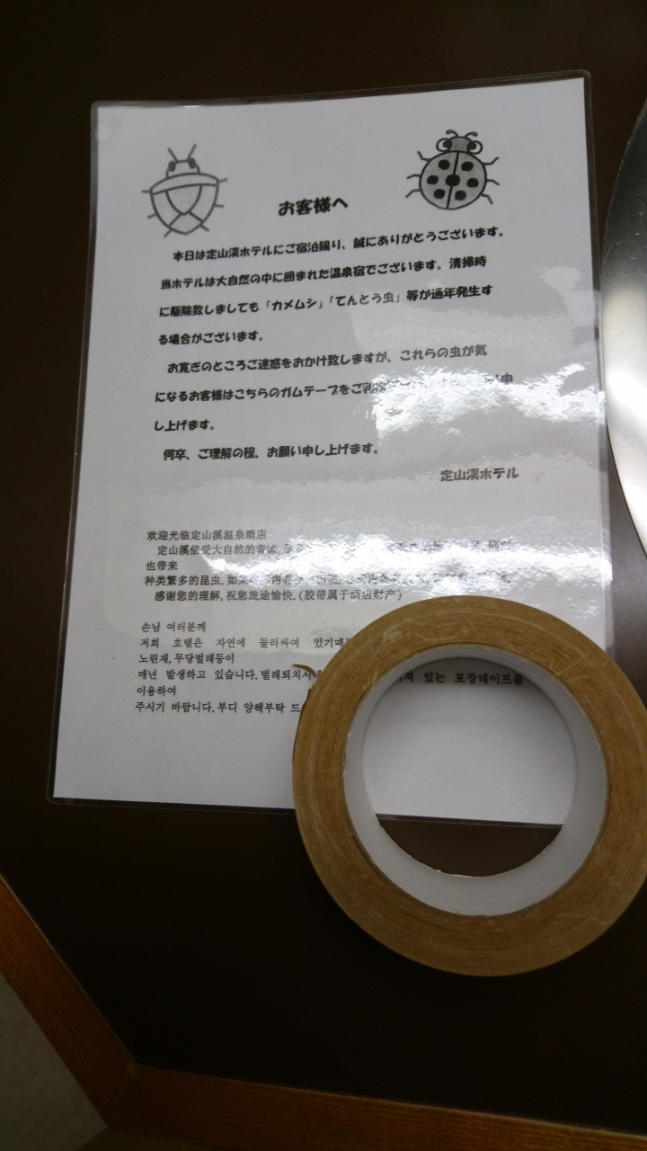 定山渓温泉でも老舗(古い)ホテルです。温泉は最高で、源泉かけ流しの浴槽もあって良き行くホテルです。いつもはリーズナブルな洋室なのですが、少し奮発したのが間違いでした。上の階で見晴らしが良いので窓に寄った時にガムテープを発見。「係の人の忘れ物では?」と思い近寄ると、これがなんと、カメムシやテントウ虫が出たとき虫を取るガムテープでした。ガムテープで虫をくっつけて取るのか?と思ったとたんすべてが暗くなりました。温泉の良さも食事もあまり良いイメージにはなりませんでした。何とかしてください。