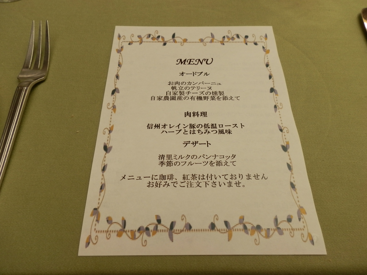 オーベルジュは宿泊できるレストランです。「牧場通りの小さな旅籠 オーベルジュ」のレストラン名は「フレンチ・レストラン ル・マリアージュ」という。オーナーシェフの五味博氏が出迎えてくれます。五味氏は清里に生まれ育ち、1986年にオーベルジュをオープンしたそうです。