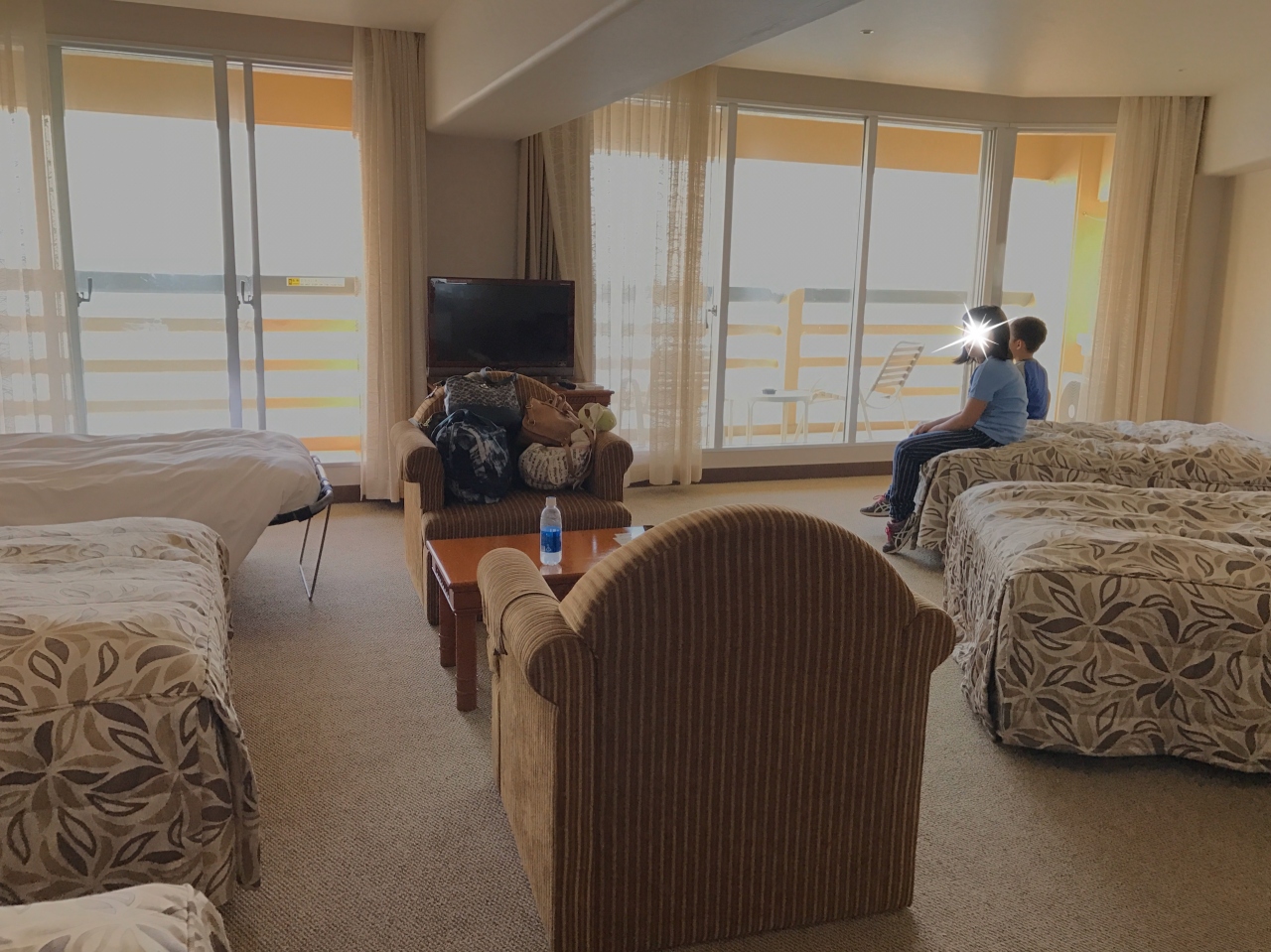 オーシャンフロントのお部屋でした。元々4台のベッドがあるお部屋にエキストラベットを追加。幼稚園児と私は添い寝をして泊まりました。シングルベッドでしたので狭かったです。