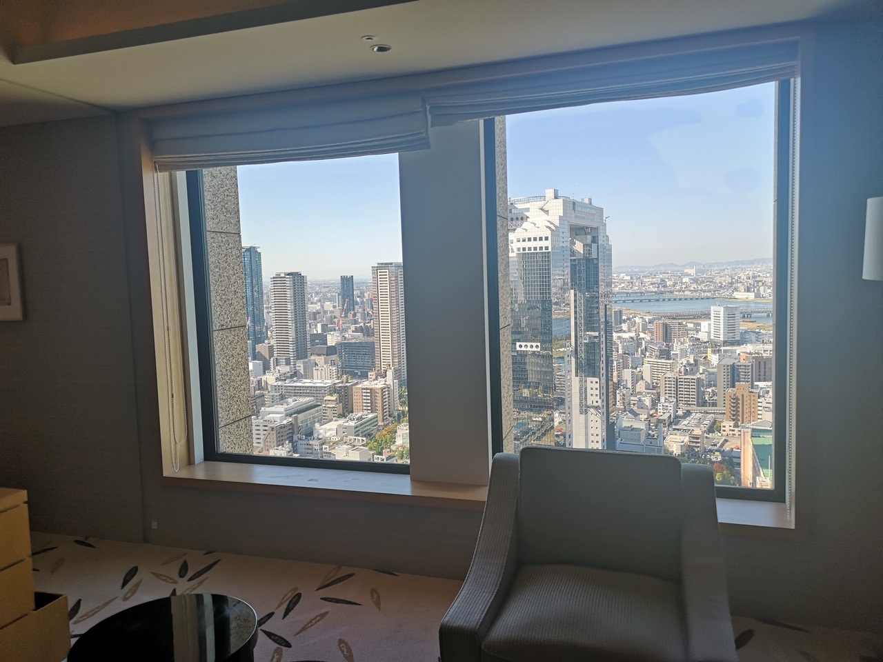 グランドフロントという商業施設とつながってはいるが想像以上に歩くことになるし入り口もわかりづらいが、その分駅から離れていて静かだしホテルに用事のある人以外はまず来ないので安心。ホテルはビルの20階以上から上の部分で高層になるが、周りも高い建物が多い為、四方八方景色がいいわけではない。景色のよい部屋を希望する場合は、最初からその内容を謳った部屋にしたほうがよい。