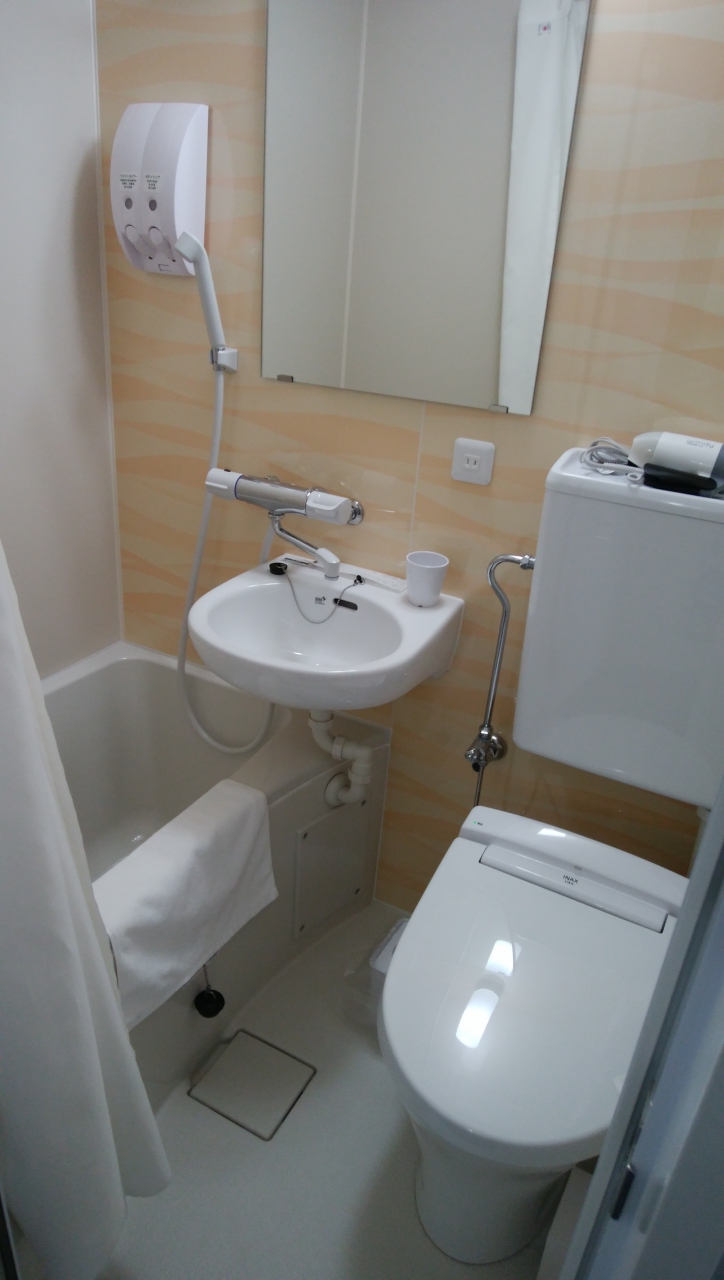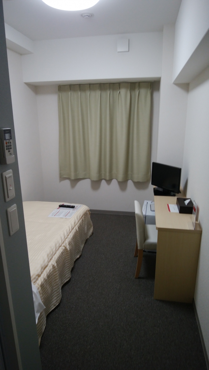 客室はシーリングライトが付いていて明るいのが〇。ですがデスクスペースが小さく、仕事がしにくいのが難点。ベッドは小さ目のため部屋は広く感じます。バスルームはかなりの狭さ。フェイスタオルはなし。アメニティは最低限。ズボンプレッサーの貸し出しもなし。ポットもついてませんでした。徹底的にコスト削減しています。