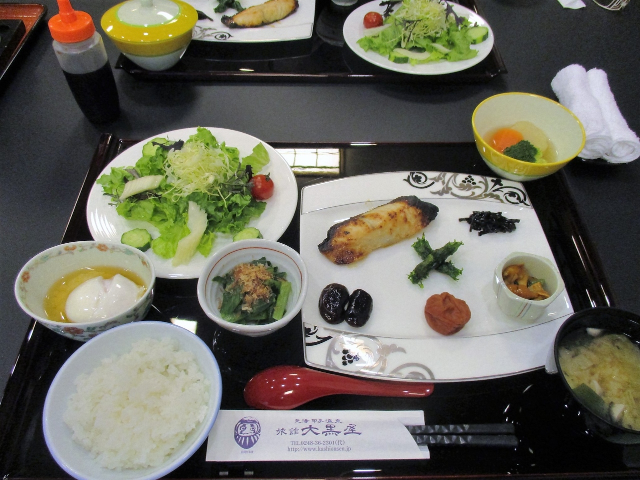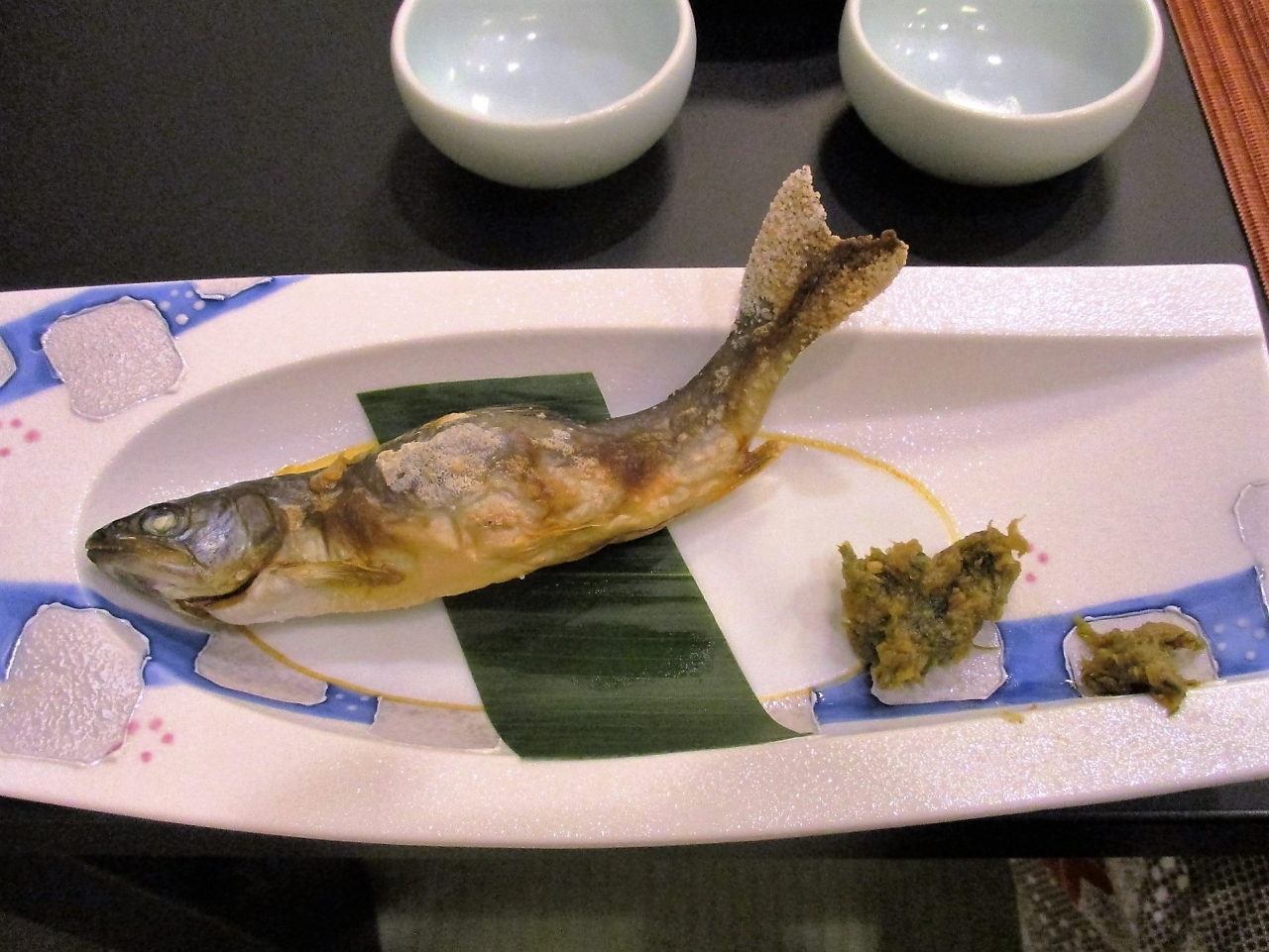 山里料理が基本で、料理は最初から置いてあるものが多く源泉せいろ蒸しが温かい料理でしたが、ヤマメの塩焼とご飯、味噌汁だけが後から運ばれてきました。