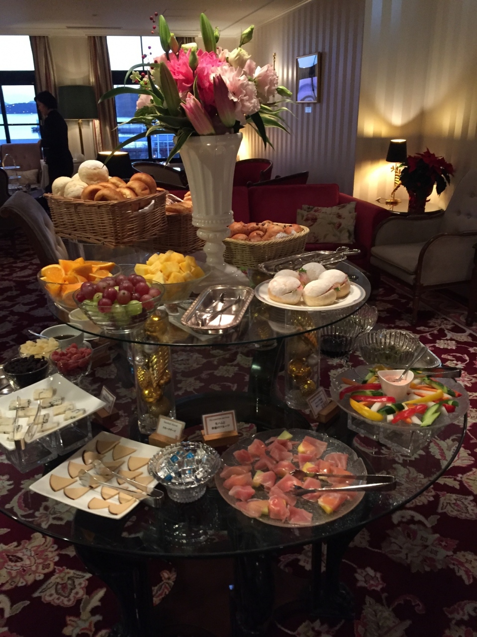ハウステンボス内にあるホテル。4階のクラブフロアはラウンジアクセスが付いており、ラウンジでアフタヌーンティー(14:30~16:30)をいただきながらチェックインし、リフレッシュメント(17:00~19:30)では軽食とアルコール類(ビール・スパークリングワイン・ワイン・ウィスキー・ブランデー)が提供され、ナイトキャップ(20:00~22:00)でも軽いおつまみとアルコール類提供、朝食(7:00~10:00)は和食洋食がしっかりいただけてスパークリングワインも提供されるといった充実ぶり。連泊の場合はお昼の時間帯もラウンジが利用できるようです。私たちは食事はラウンジ内で事足りました。