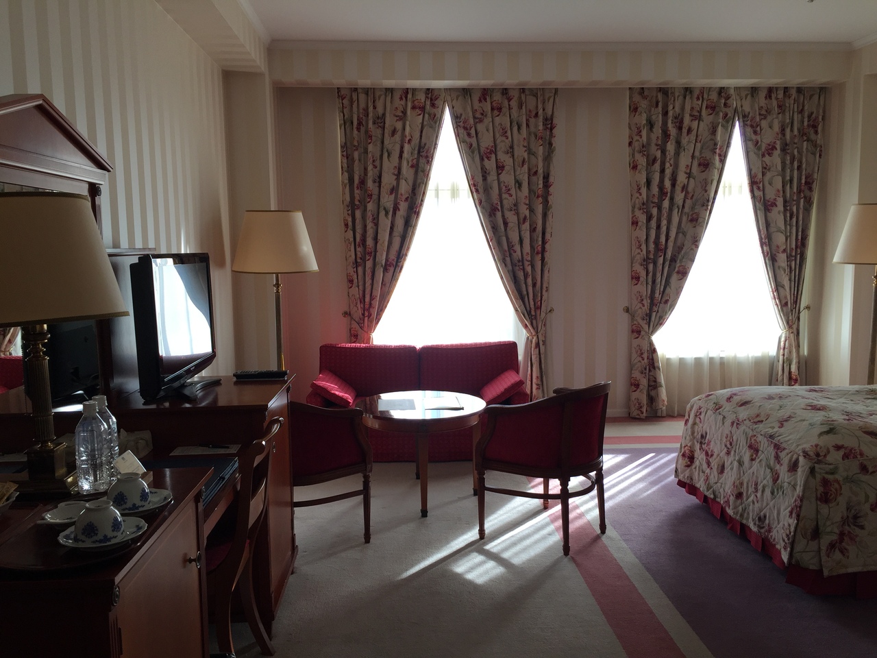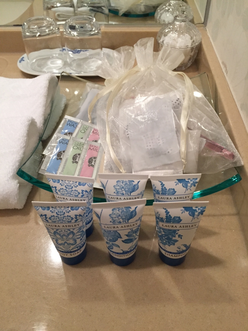 お部屋はローラアシュレイで統一されたとても素敵なお部屋。以前はローラアシュレイルームと言われていたようです。アメニティーまでローラアシュレイ。クレンジングや洗顔、化粧水、乳液もありました。