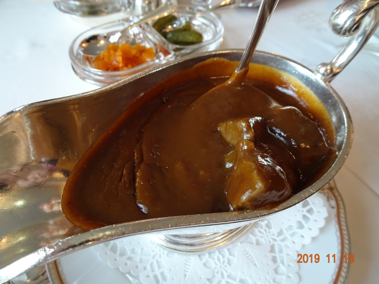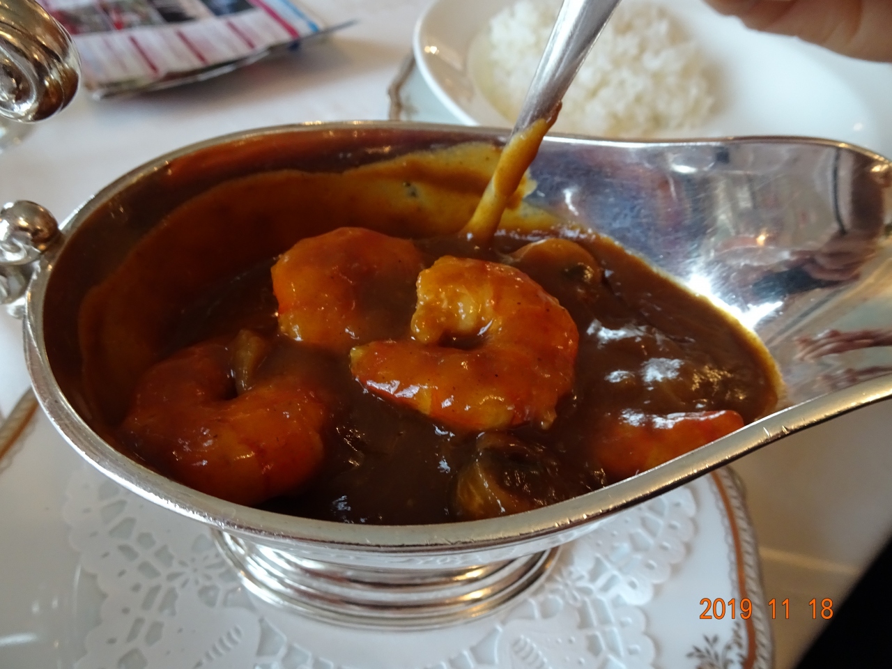 ランチのカレーを食べました。牛肉と海鮮のカレーの2種類です。サラダ、前菜、コーヒー付きで2500円。ランチでは高価ではと思いでしたが、食べて納得です。牛肉はとろけるそう、海鮮の海老はぷりぷりで最高です。