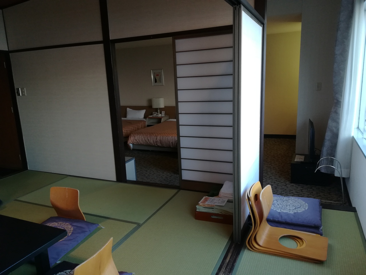 友人との旅行で6人部屋に宿泊。ベッド2台の和室部分に4人分の布団でした。