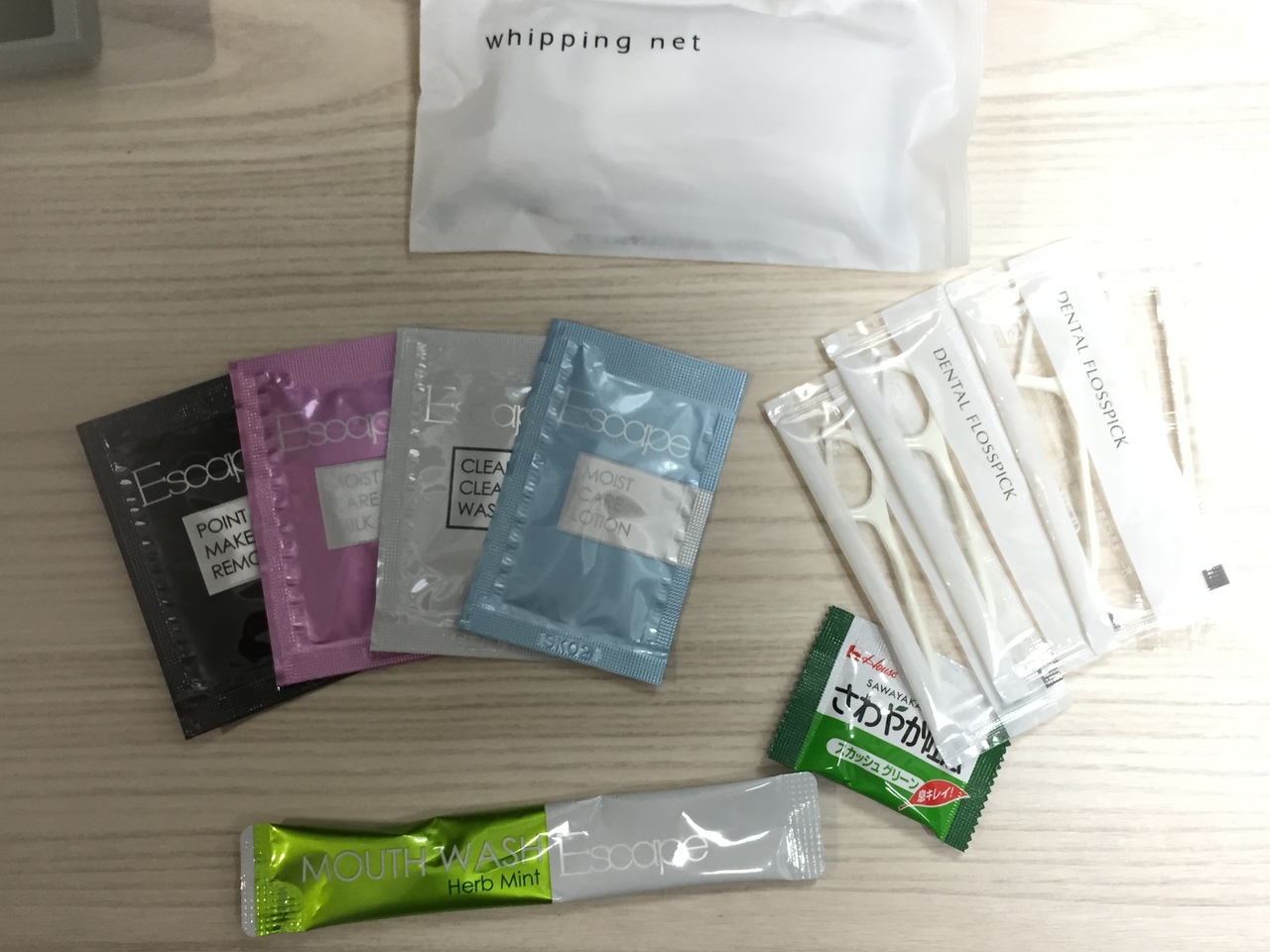 アメニティがかなり豊富で、1回使い切りの化粧水、乳液、洗顔、メイク落としだけでなく、マウスウォッシュや歯間ブラシ、入浴剤までありました。シャンプーリンスも数種類の銘柄から必要分取ってくかんじでしたが良かったです。