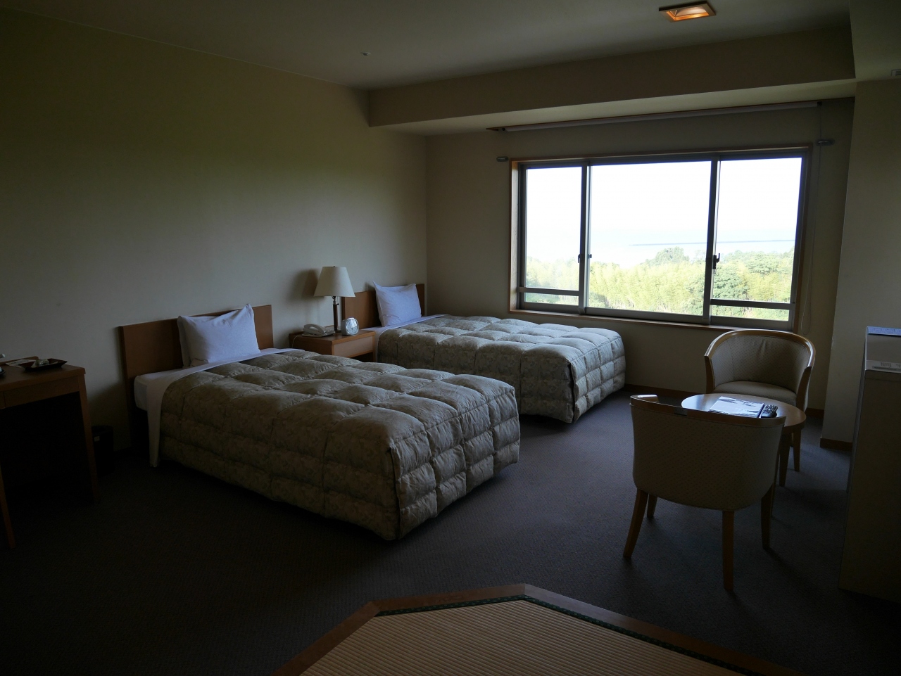 部屋タイプがおまかせのプランで宿泊しました。案内されたのはツインルームで3畳ほどの畳のコーナーが付いた部屋です。思いの外広々とし、ゆったり過ごせました。高台にあり窓からの眺めも素晴らしいです。