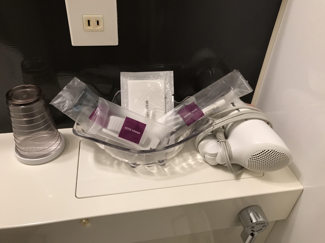 洗面所のコップは、一般的には洗浄済みとか書いた紙が掛けられていたりするが、このホテルでは、ただコップ受けの上に伏せられていただけだったので、チョットそのまま使うのはためらわれた。
