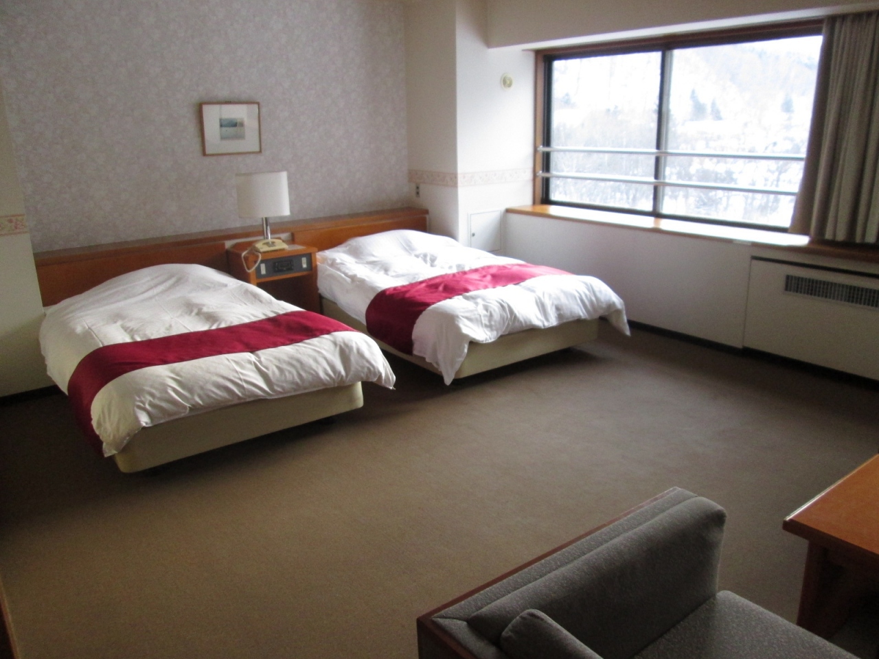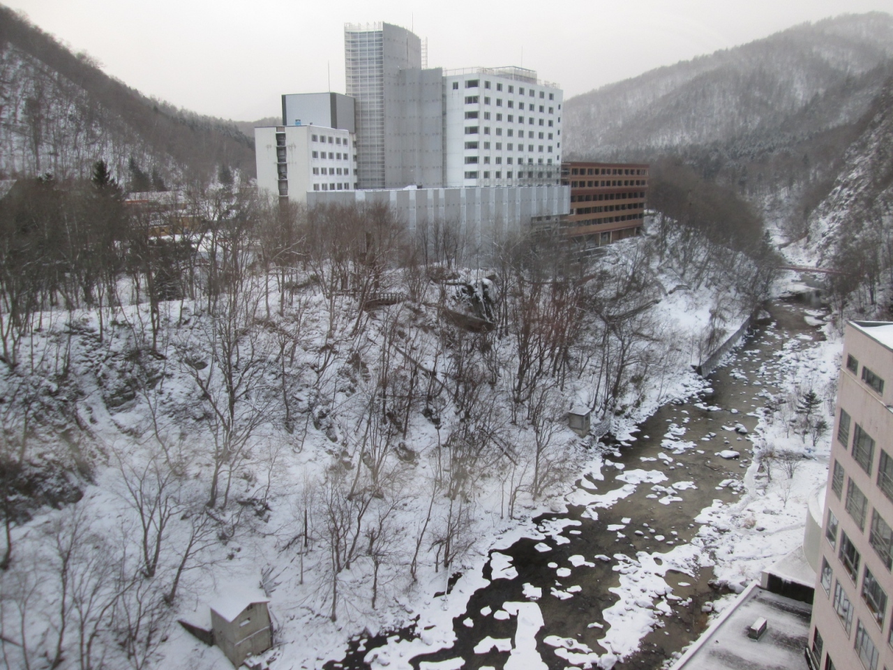定山渓温泉の豊平川沿いにある老舗ホテルで、建物は古く経年を隠せませんが、清掃はきちんとしていました。