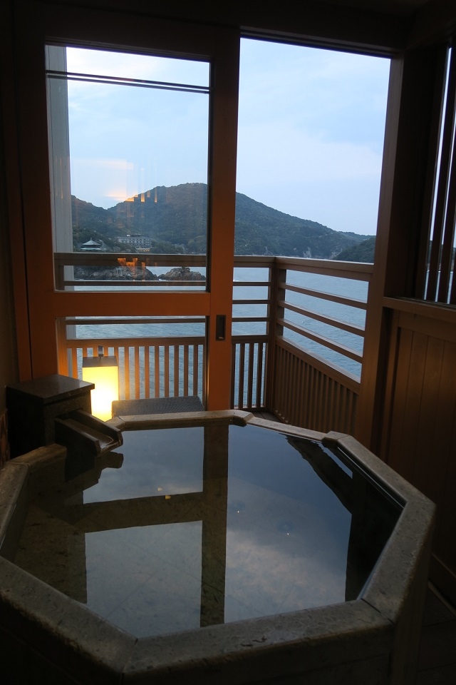 お風呂は、部屋付き露天のほか、予約できる貸切風呂が2か所、それから姉妹館の鴎風亭のお風呂も利用できるので、さまざまなバリエーションで楽しめます。