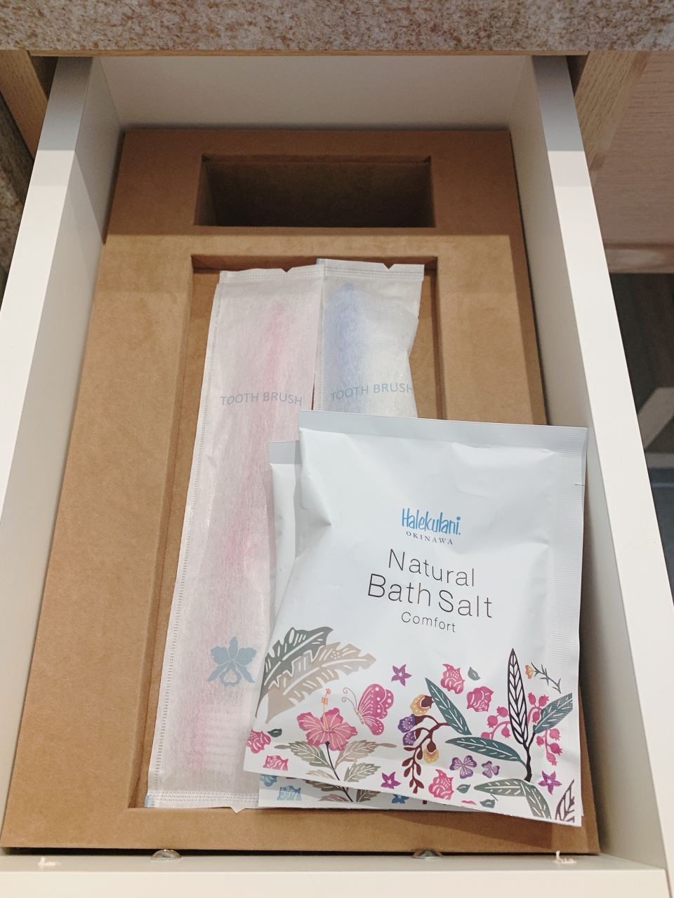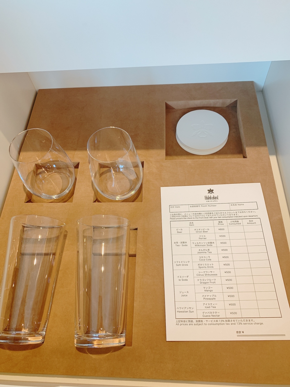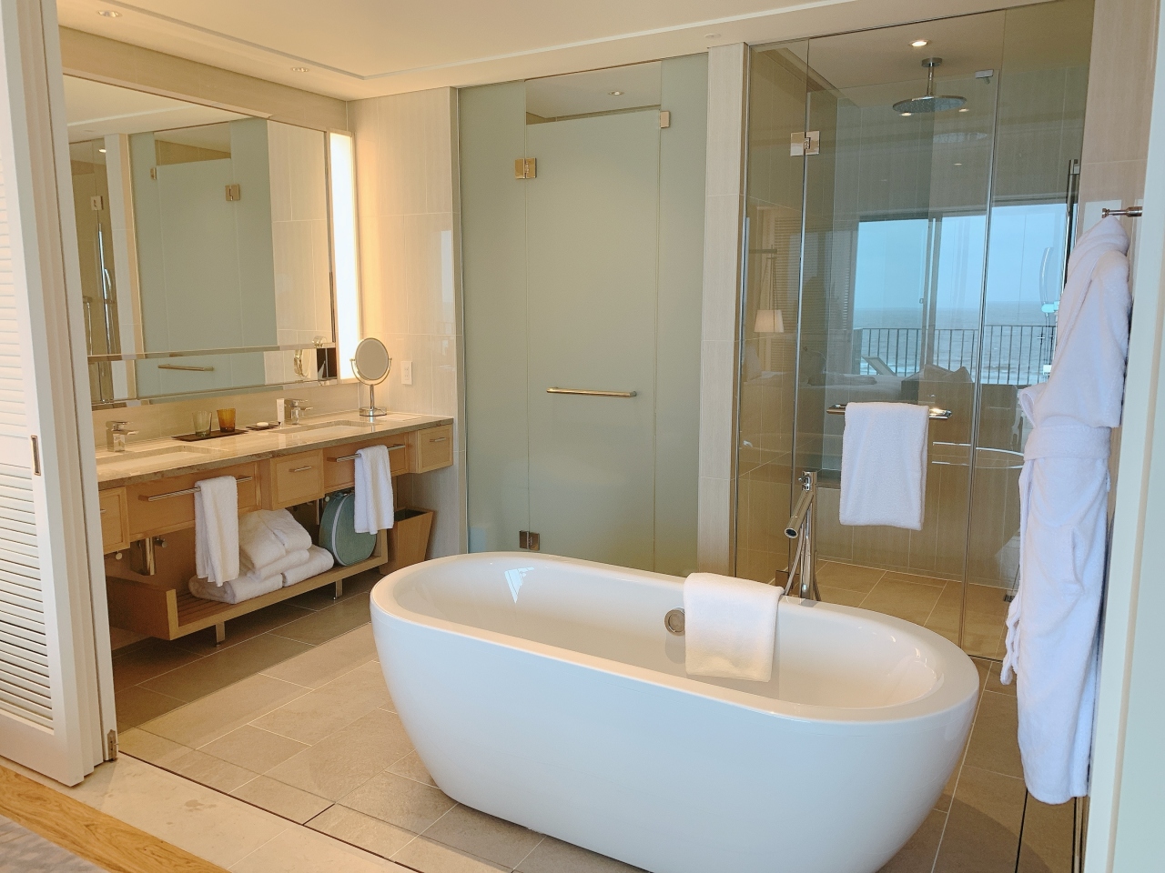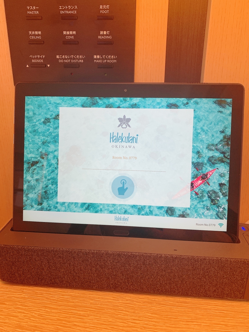 部屋は最低でも50平米あり広々としており、レストランやコンシェルジュとの連絡用のタブレットが置いてあり便利でした。テラスは広くありませんが、沖縄の綺麗な景色を一望できます。