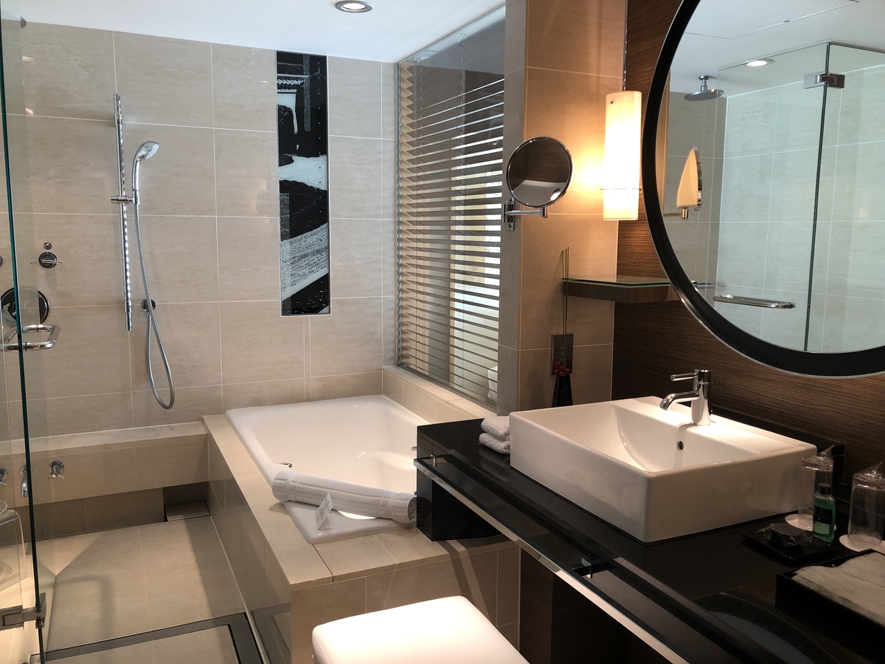 天井が低いからか部屋はちょっと窮屈に感じましたが、バスルームは使いやすかったです。バスタブのお湯もすぐに溜まるし、バスソルトではなくバスミルクが2種類置いてあるのも気に入りました。ただ、クローゼット、たんす、金庫が何故かトイレにあるという造りが謎でした。部屋からの眺望は、真下にメイン棟の増築部分の緑色の屋根が広がってはいるものの、その先には緑豊かな庭園と東京タワー、富士山も見えました。