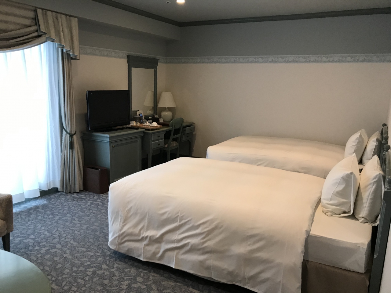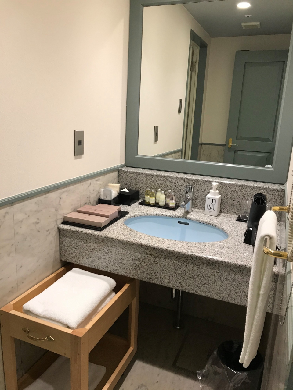 部屋は8階でした。フロアごとにイメージカラーが違うそうで、8階はミントブルーでした。部屋は充分に広く、ソファーもあって寛げました。バス、トイレも別で使いやすいです。アメニティには、女性用化粧品セットもついていました。ミネラルウォーターも2本サービスでした。