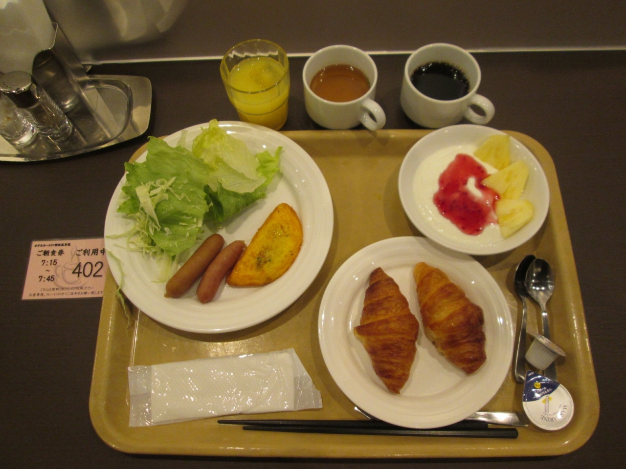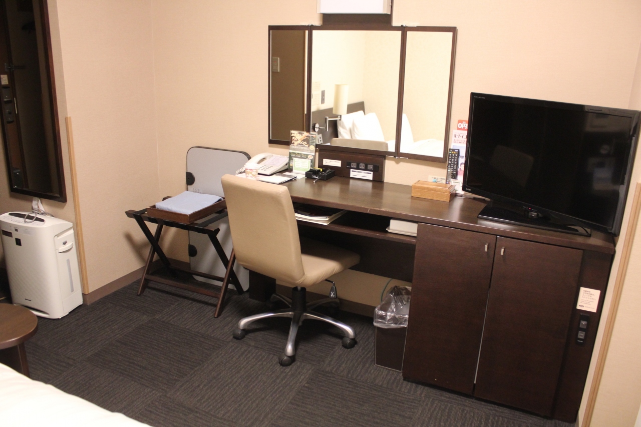 良かった点は、駅から近く、ルートイン品質(部屋がやや広い、朝食の質が良い、大浴場がある)が保たれていること、ズボンプレッサーと空気清浄機があり、フェイスタオルが2本ありました。