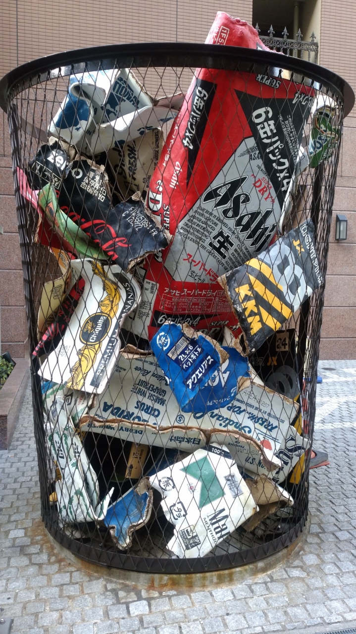 正面入り口に空き缶入れの大きなオブジェがあります。(ウン千万円したそうな)