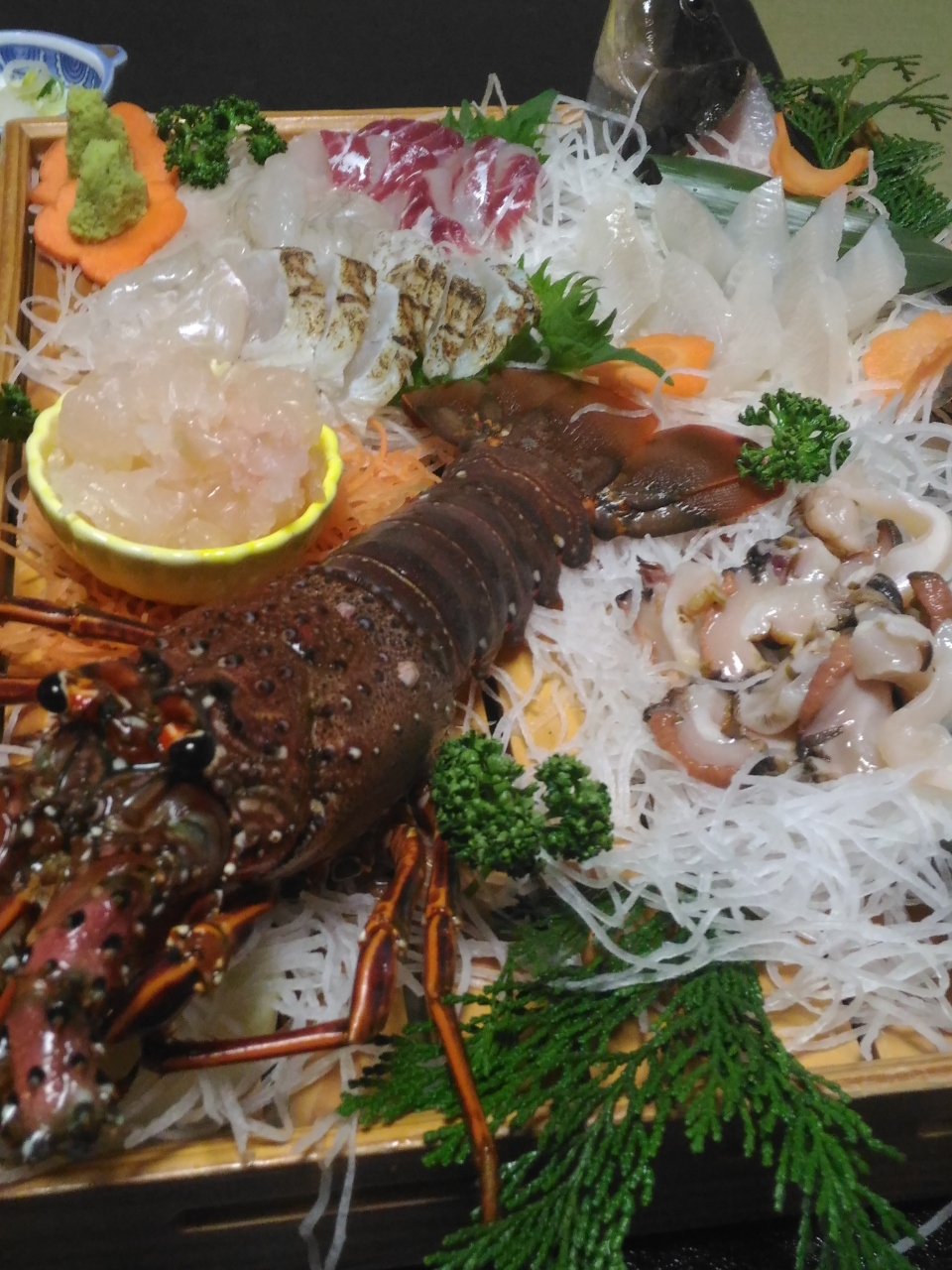新鮮な魚や伊勢海老のお刺身などなど、海の幸満載の夕食は