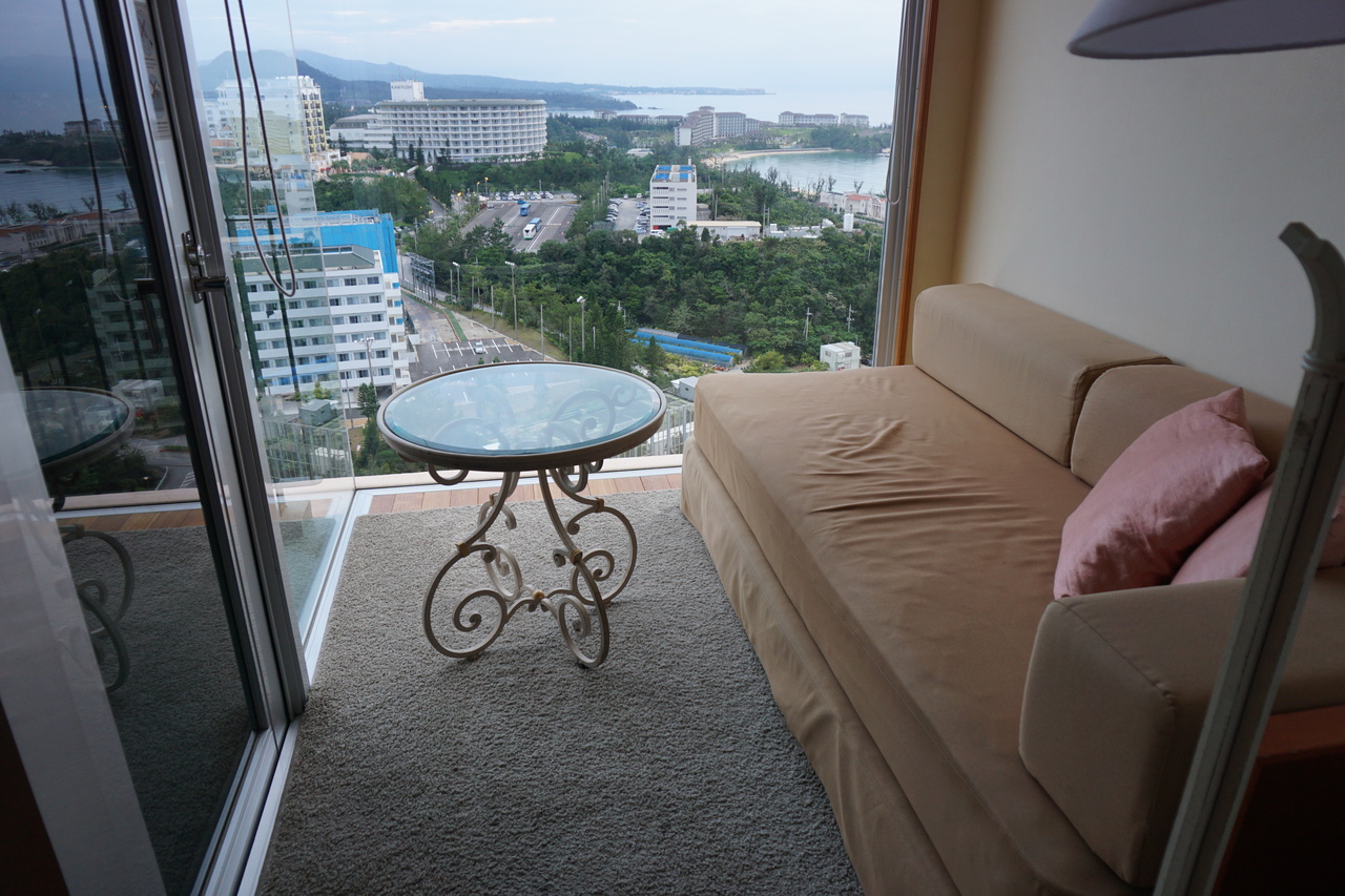 部屋の窓際には、バルコニーだけでなく、外がよく見える位置にふかふかのソファーがあり、くつろぐのには最適でした!