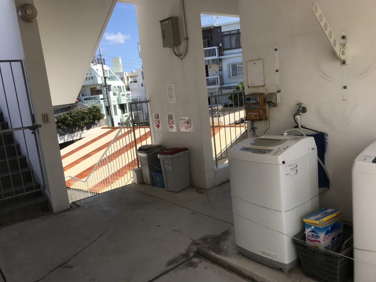 洗濯機は100円で使えます、周りは那覇の古き街並みが所々に残る静かな一角