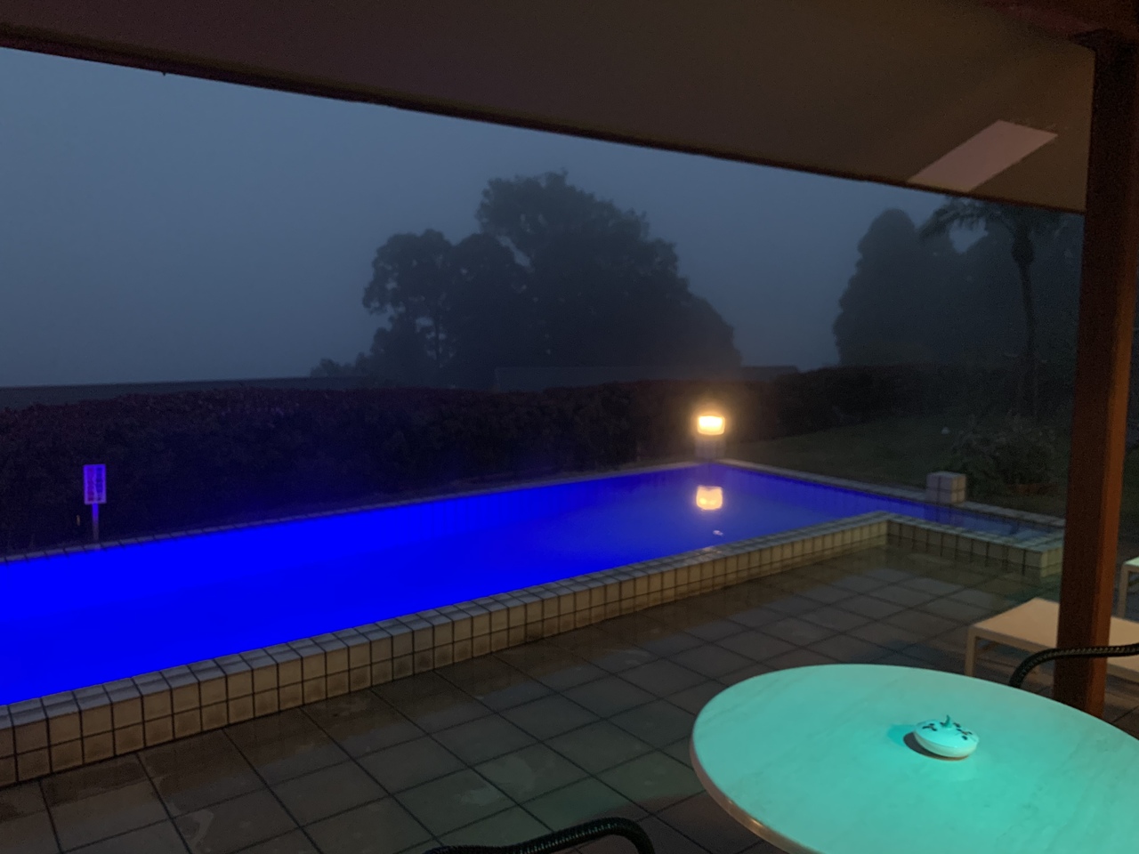 屋内はシャワースペースのみ、部屋の庭に露天風呂とプールがあります。海側なので、塩分強めの温泉です。