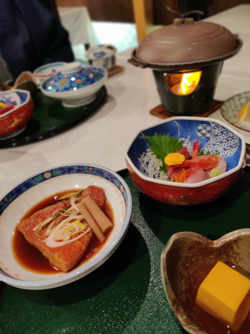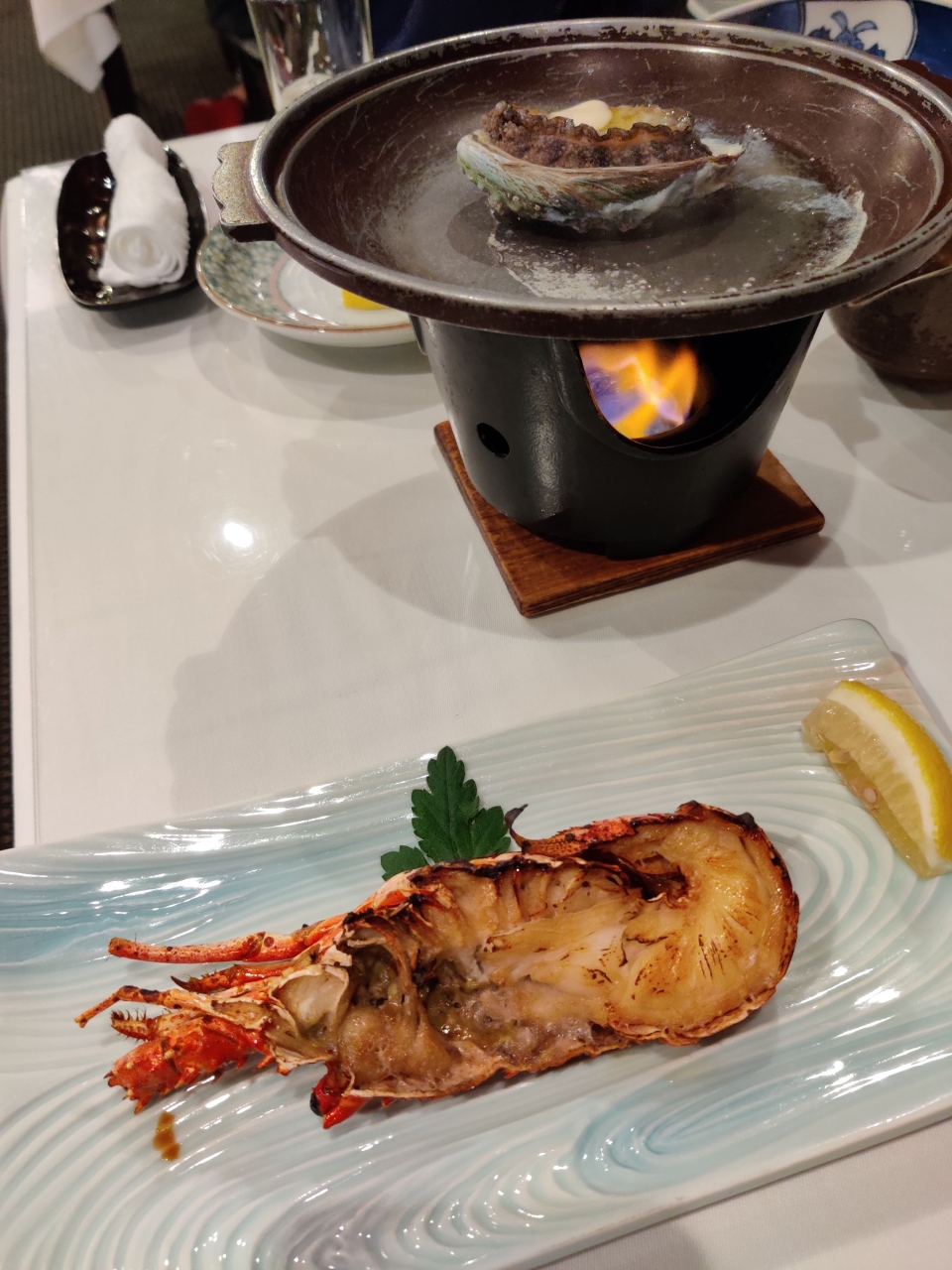夕食は小型の鮑の陶板焼き、伊勢海老の鬼殻焼き、金目鯛の煮物、造りなどが付くもので、新鮮さ、味付け、ボリューム満足度の高いものだった。