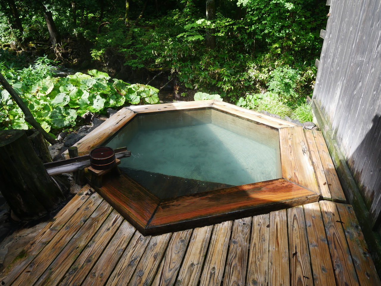 貸切露天風呂は、施設の外にあり、囲いはあるが、かなり開放的で、川と山を身近に感じ入浴を楽しむことができる。