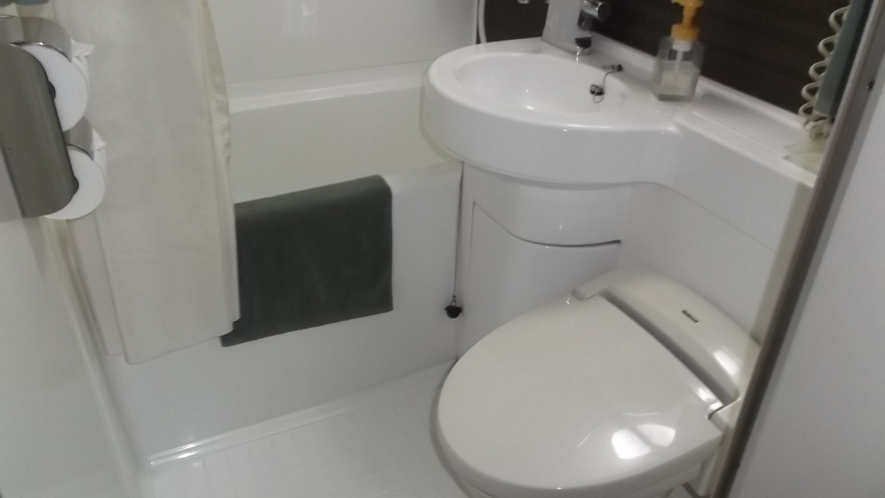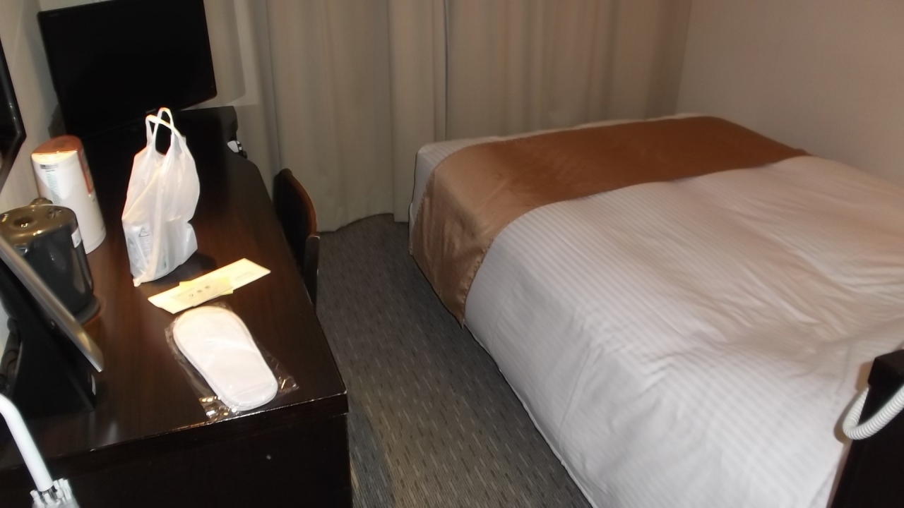 福知山駅北口から徒歩3分(300m)、館内はとても綺麗で落ち着いた雰囲気、部屋も清潔感にあふれ、特にユニットタイプのバス・トイレ・洗面は白と壁の茶色がよくマッチしている。ベッドはダブルサイズで大きい。