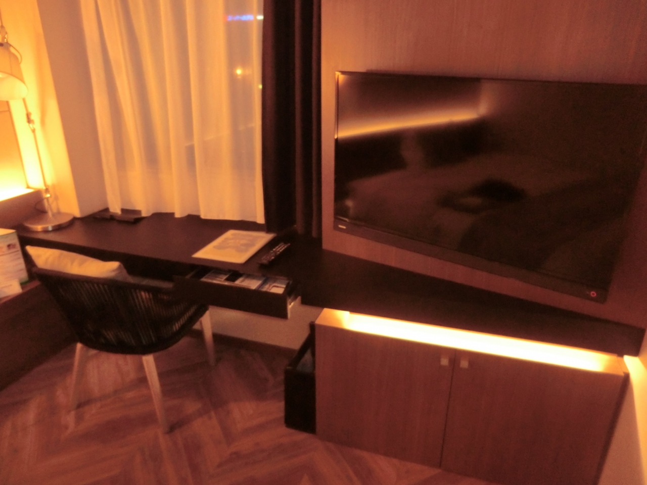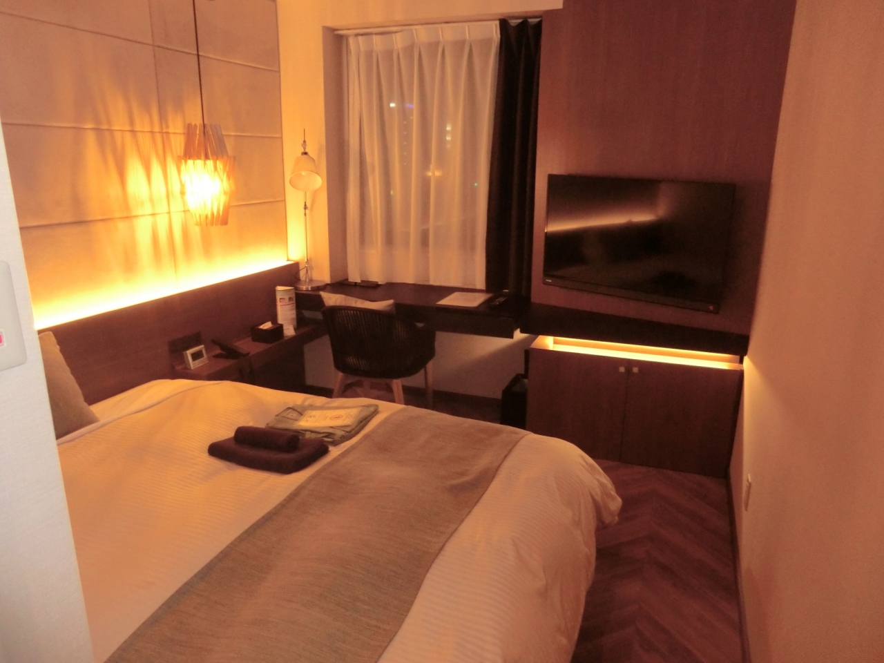 客室は16㎡の禁煙シングルルームで、横1.6m 長さ2.0mと大き目のベッドが置かれているので、少し狭く感じるかもしれません。
